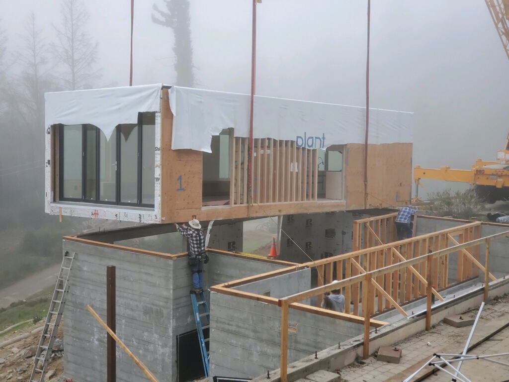 Partnering with a factory outside of Los Angeles, the custom home was able to navigate tight road restrictions and arrive onsite partially complete. In total, three custom modular units– shifted in plan to maximize northeasterly mountain views– were set upon a concrete plinth poured into the hillside.