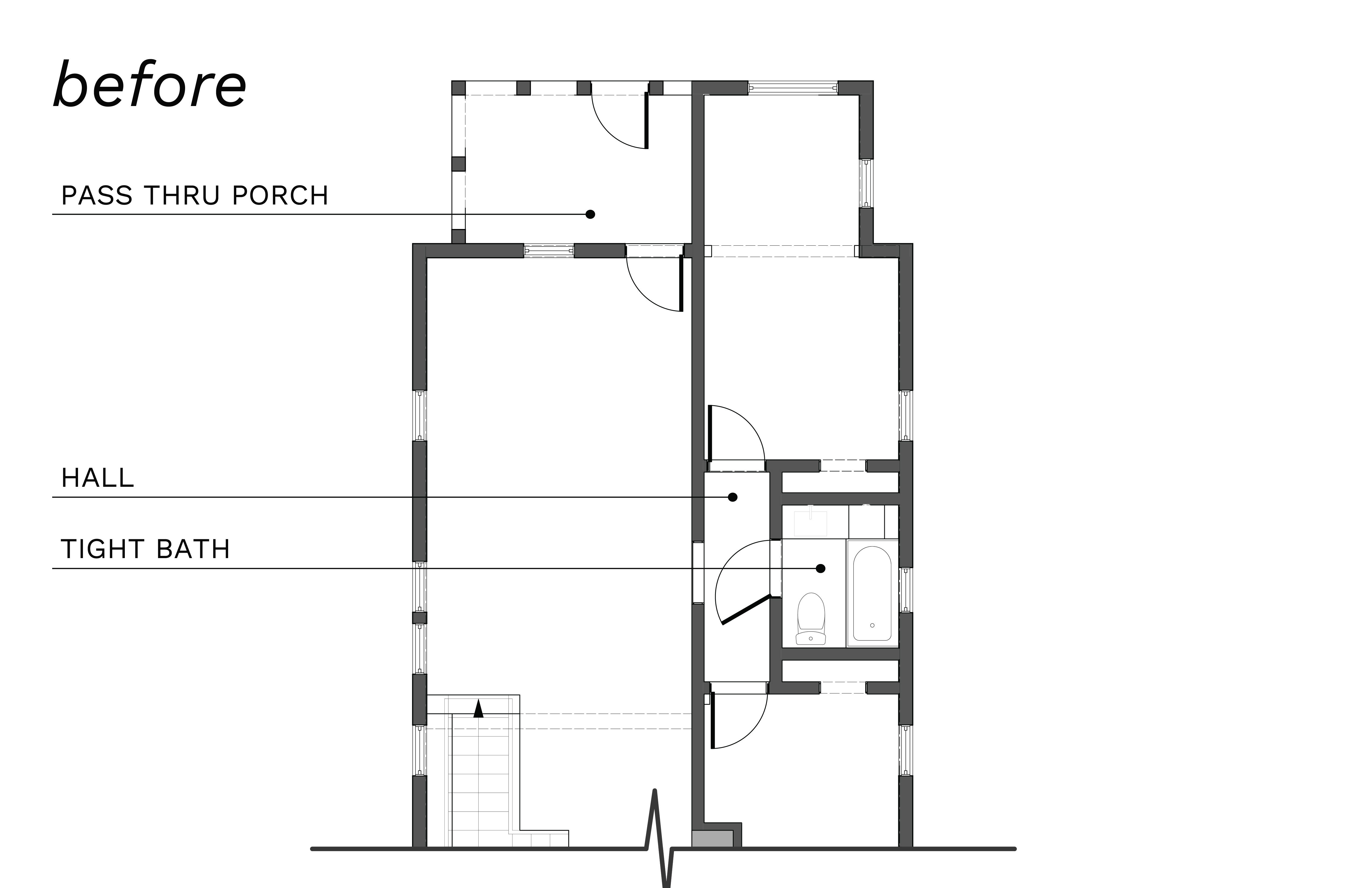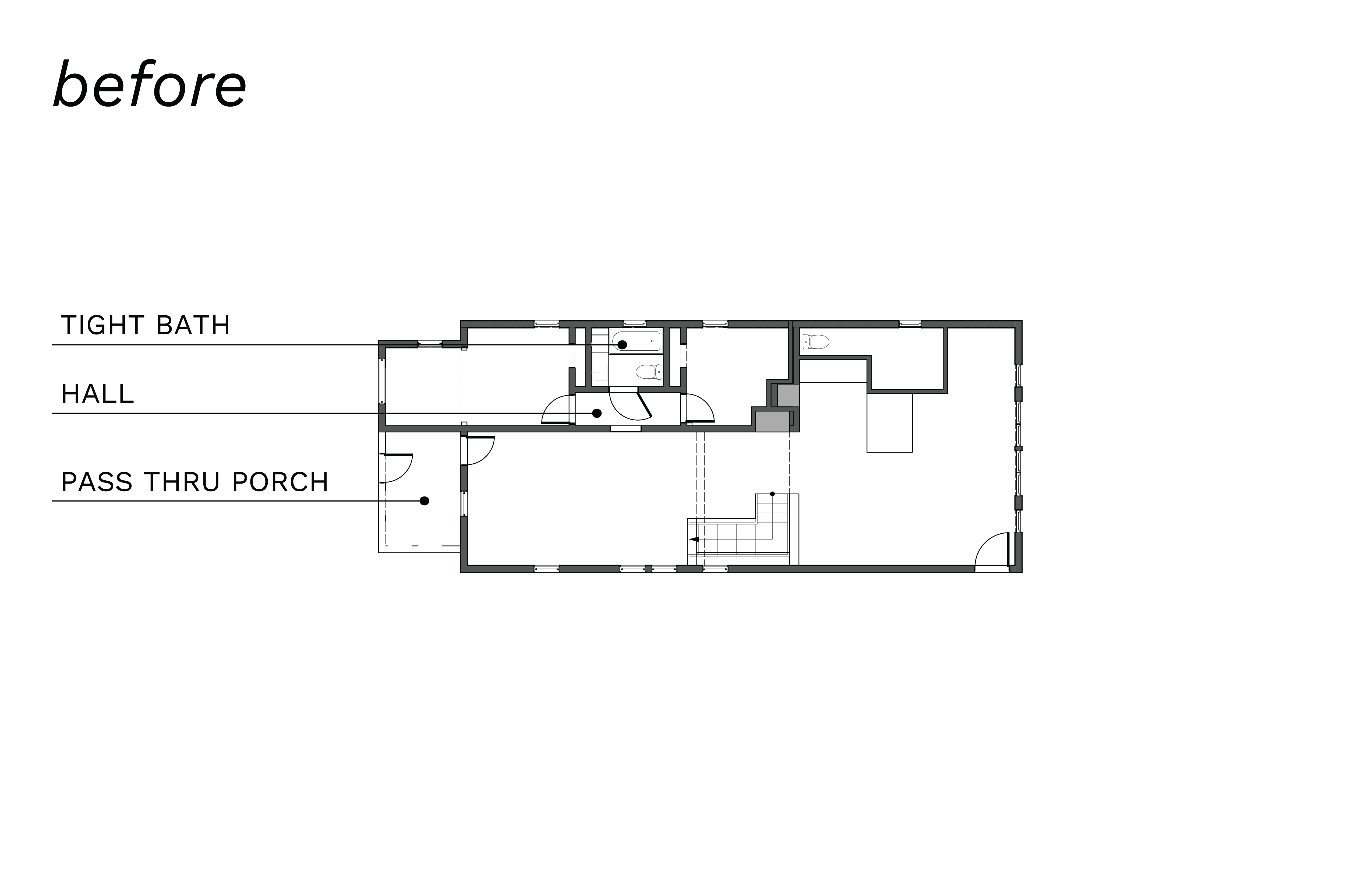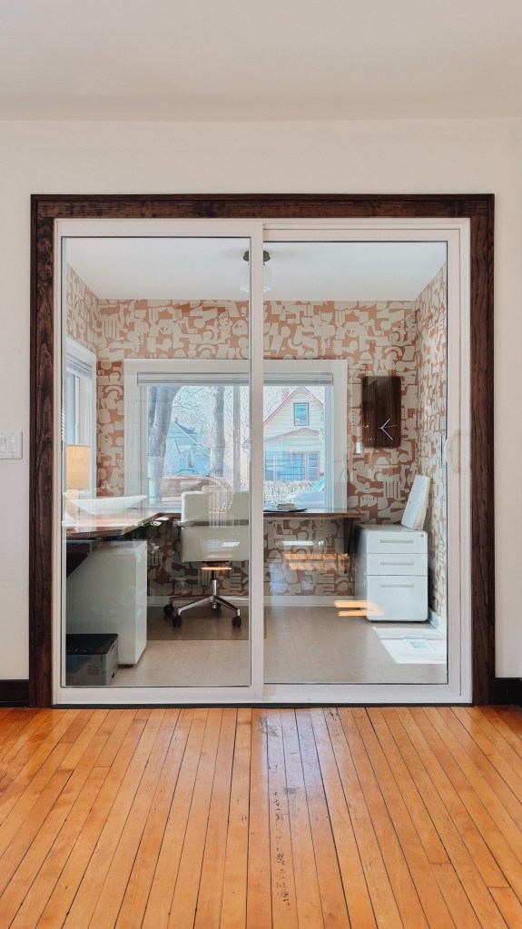 Through a pragmatic elimination of a hallway, this young family gained a generous bathroom and new primary closet. The project also involved converting their front porch into an office separated by a sliding partition. Even the nursery received a new doorway, new wallpaper, and artwork. In all, a thoughtful and meaningful reshuffle for everyone in this growing household.