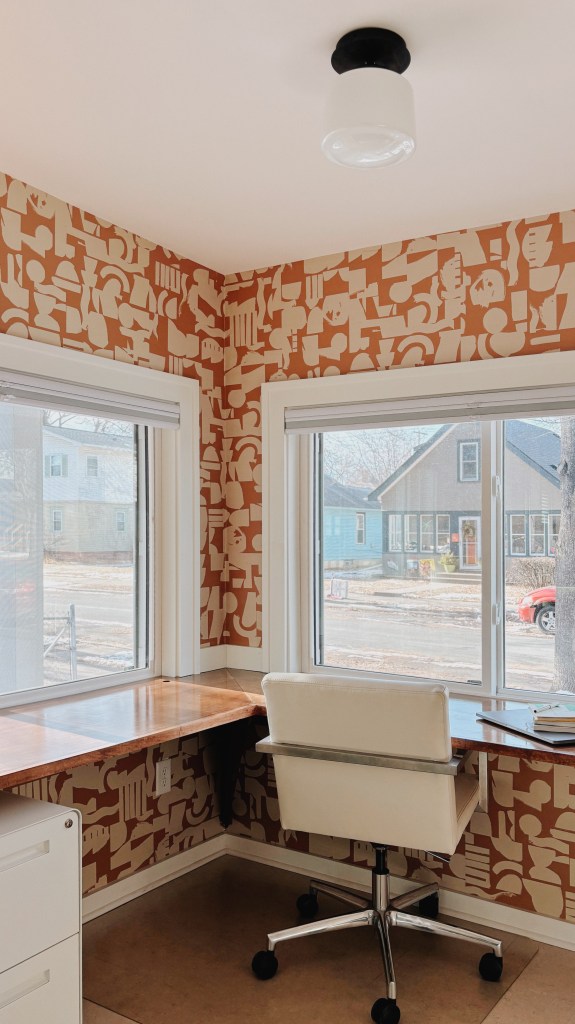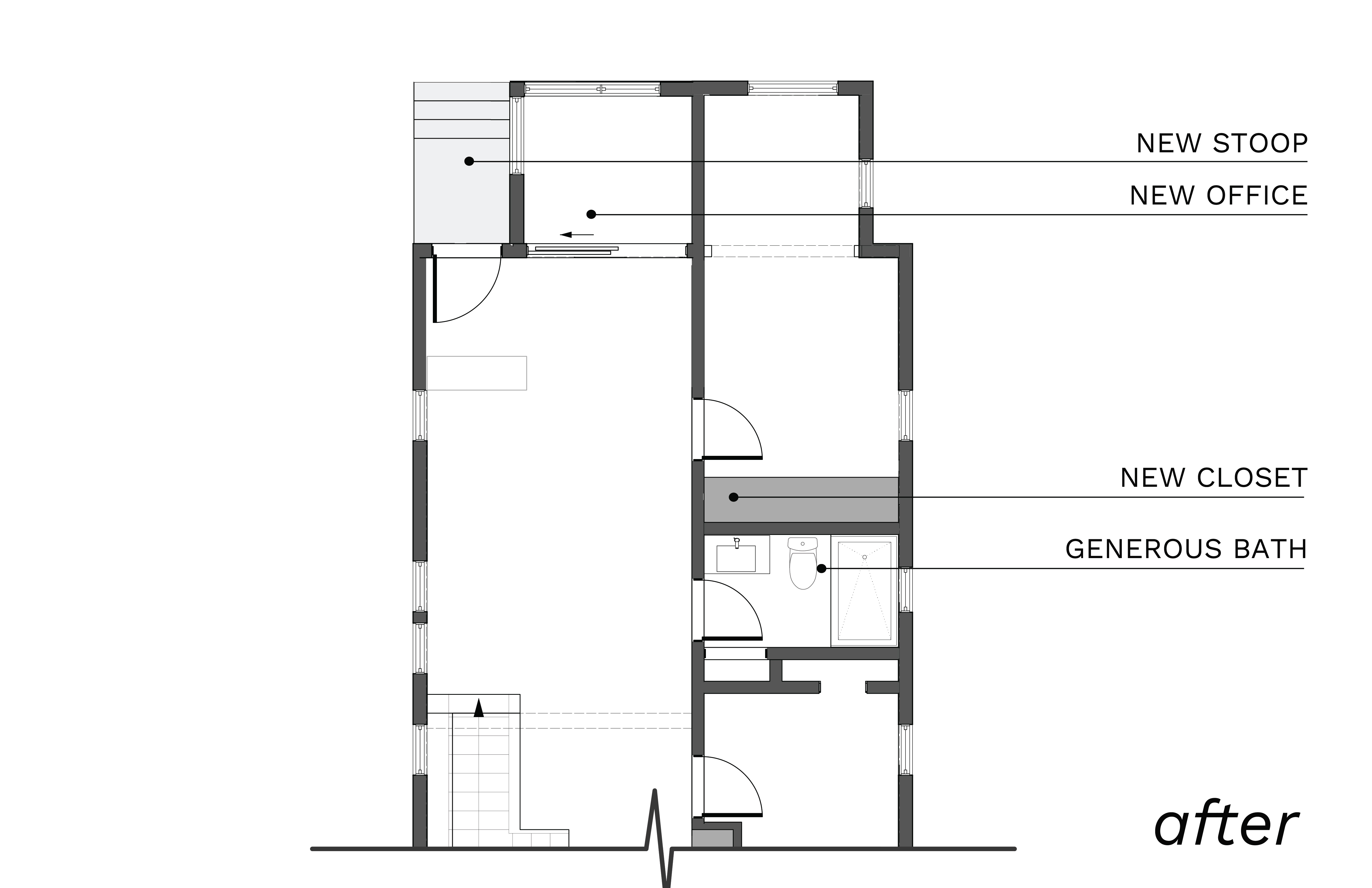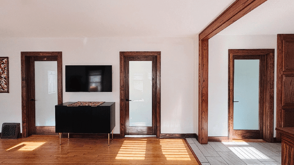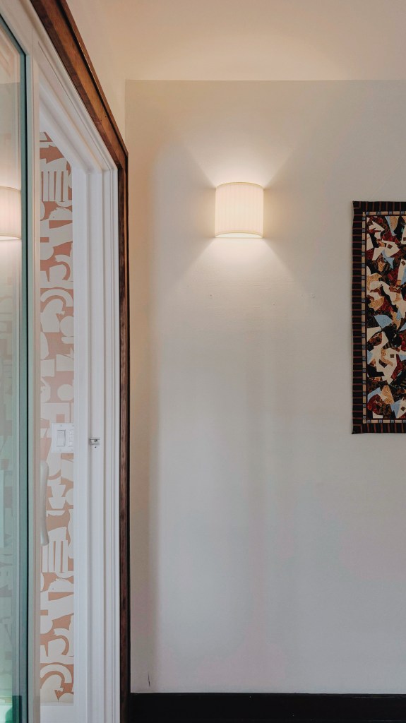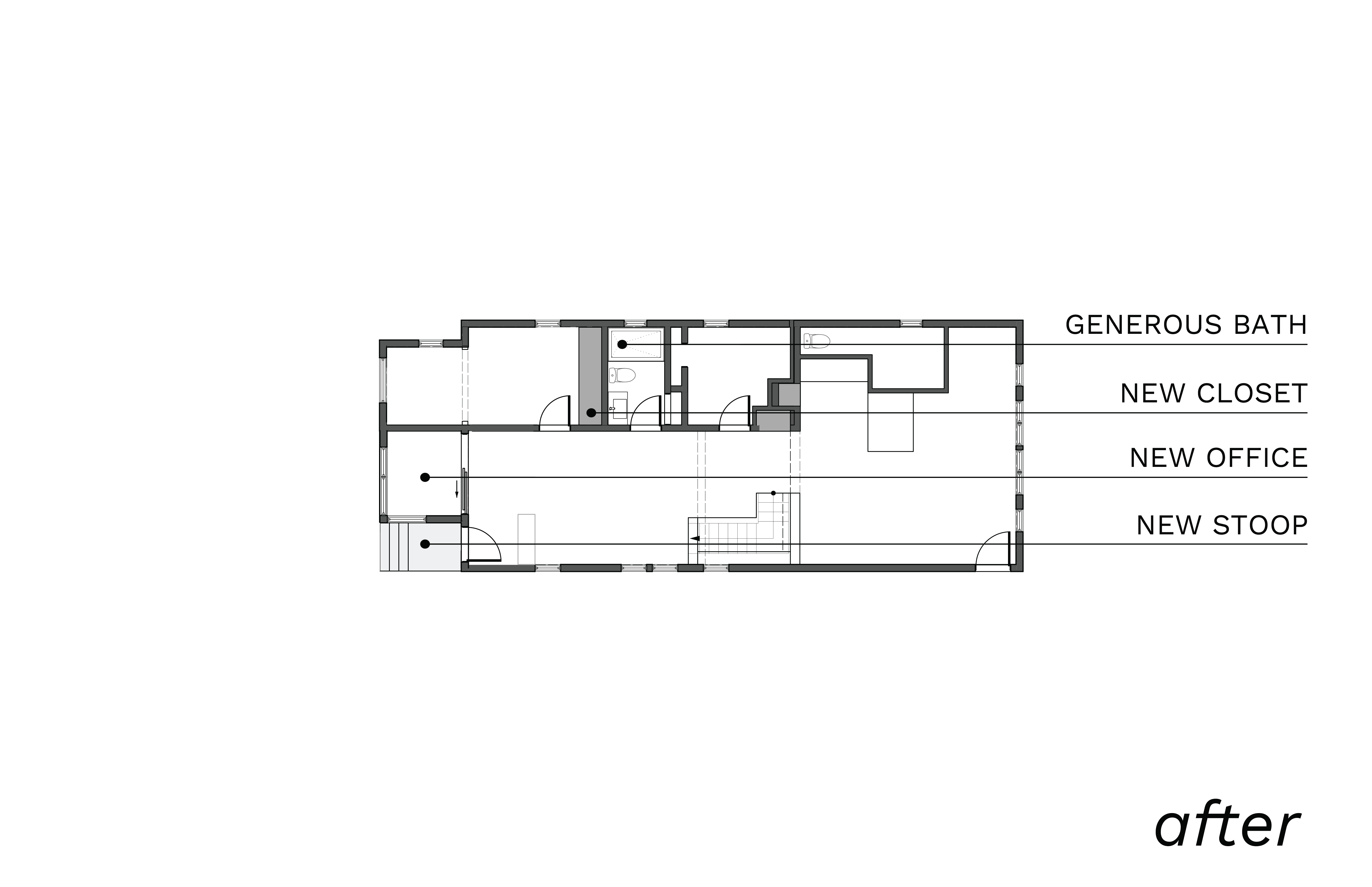 Through a pragmatic elimination of a hallway, this young family gained a generous bathroom and new primary closet. The project also involved converting their front porch into an office separated by a sliding partition. Even the nursery received a new doorway, new wallpaper, and artwork. In all, a thoughtful and meaningful reshuffle for everyone in this growing household.