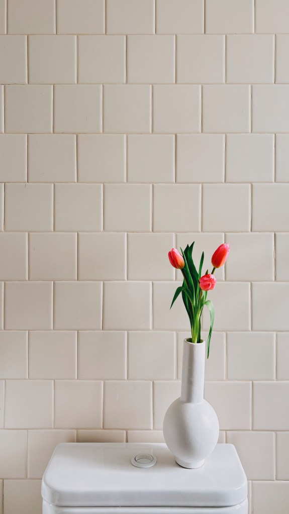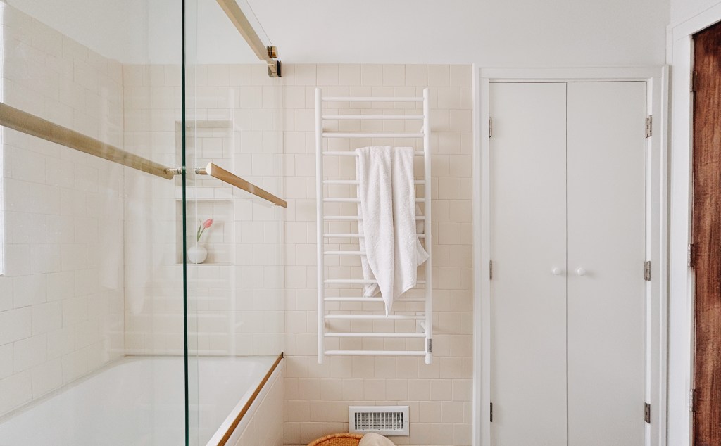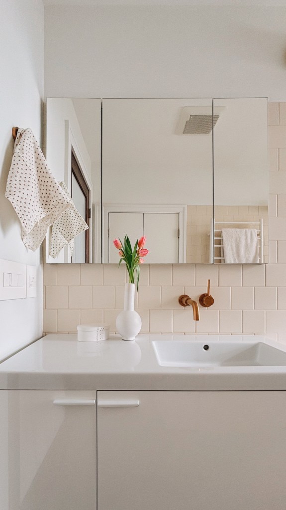 The updated bathroom addressed a cramped original layout with new bath fixtures that eliminated old plumbing leaks. The wall mount faucet and floating sink and vanity provide an elegant look especially paired with the calming, quiet tiled space and brass hardware. The tile is an almond finish, running bond with bull nosing that complicated the install but simplified the overall look.