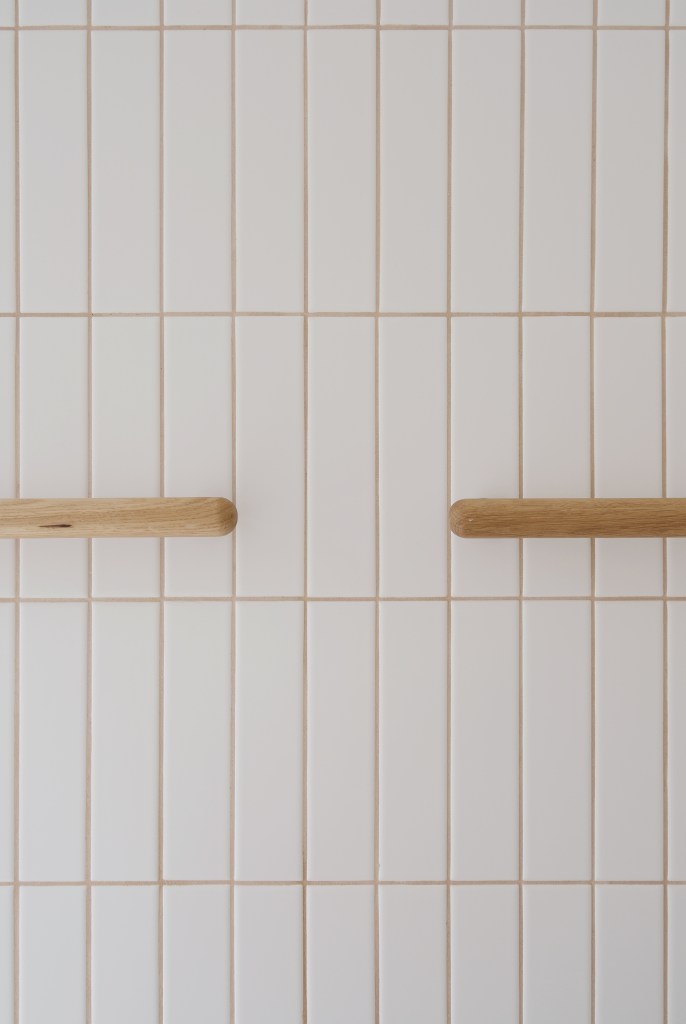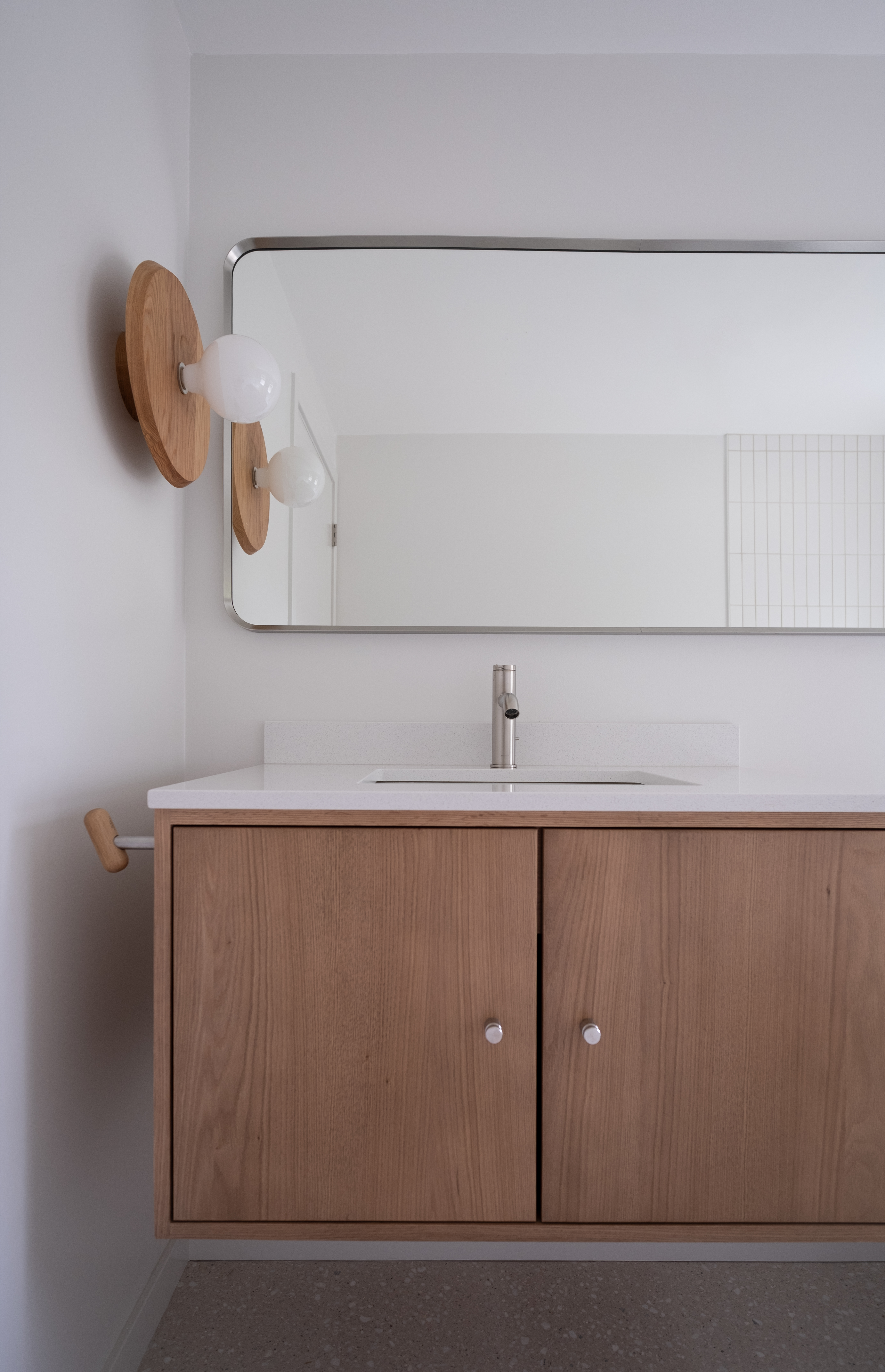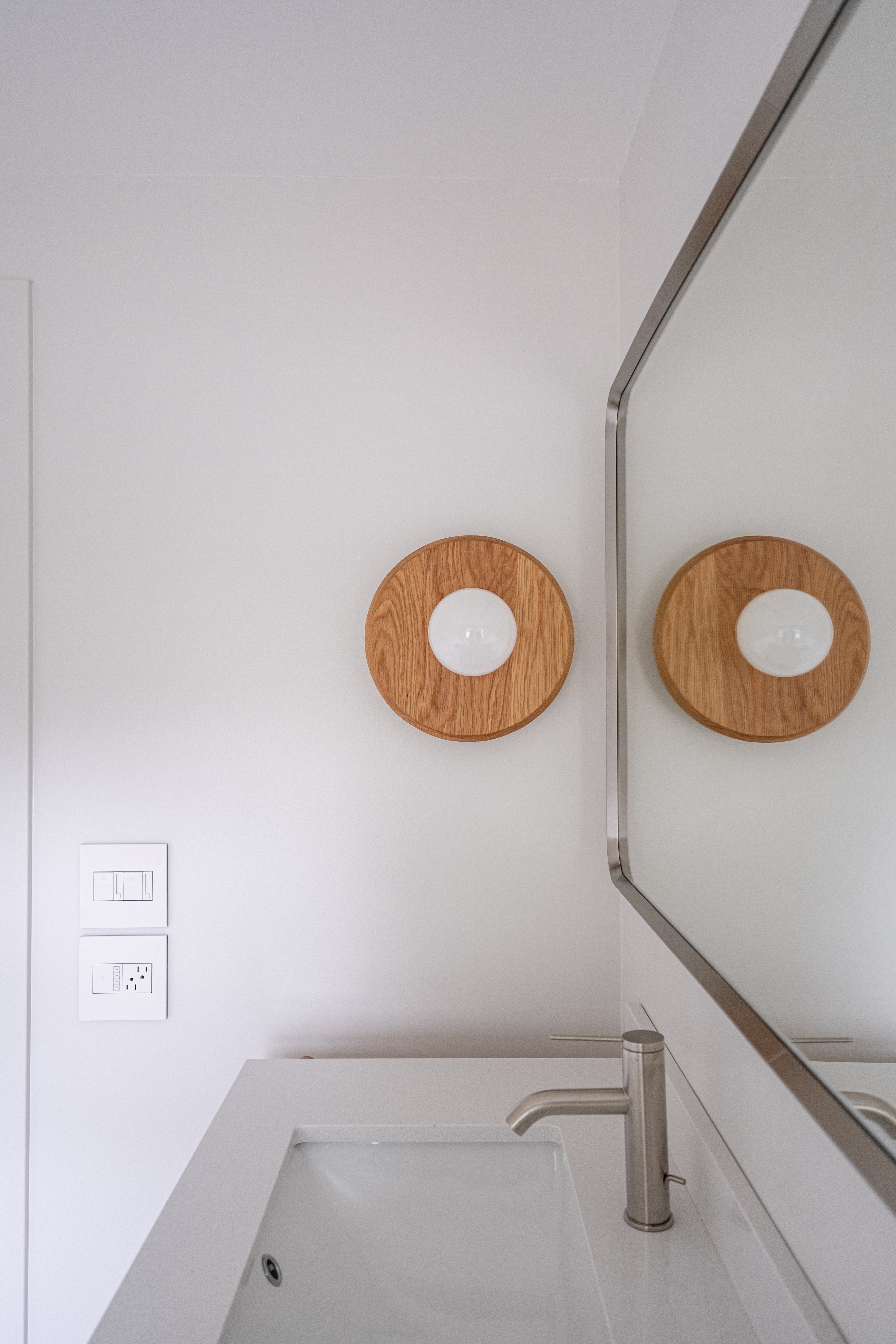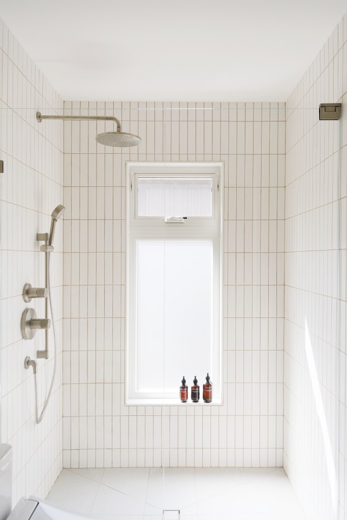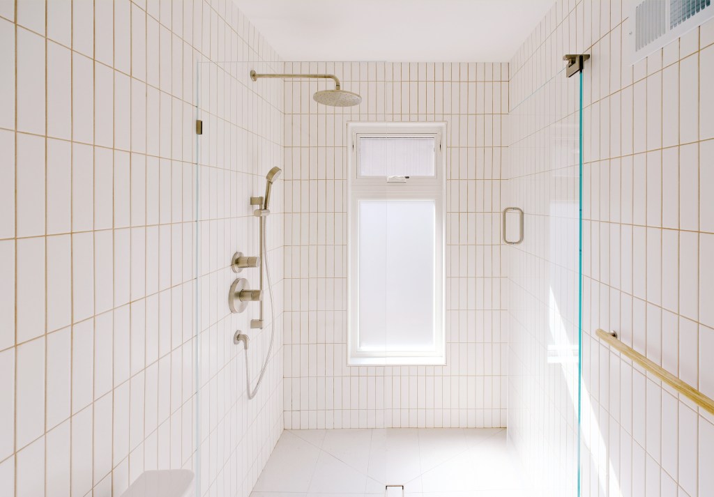 The dimple sconce is frosted mimicking the tall frosted window. This new window reused the framing width of the existing window unit but is topped with a clear, operable transom above. The in-shower window has a solid surface stone sill for moisture management and doubles as a ledge for shampoo, body wash, etc. The floor tile and integrated drain cover have texture and grit for safety in the age-in place condition.