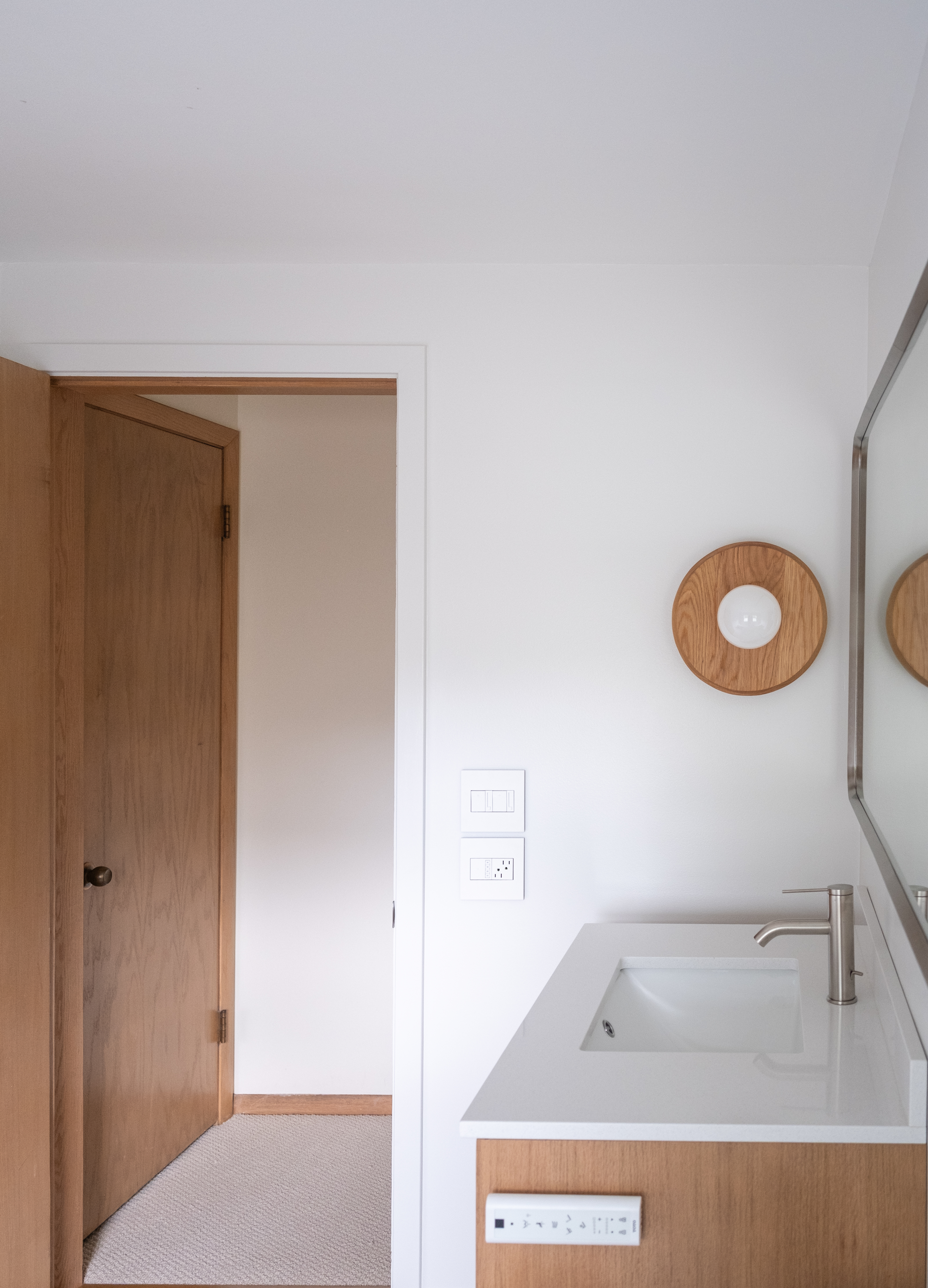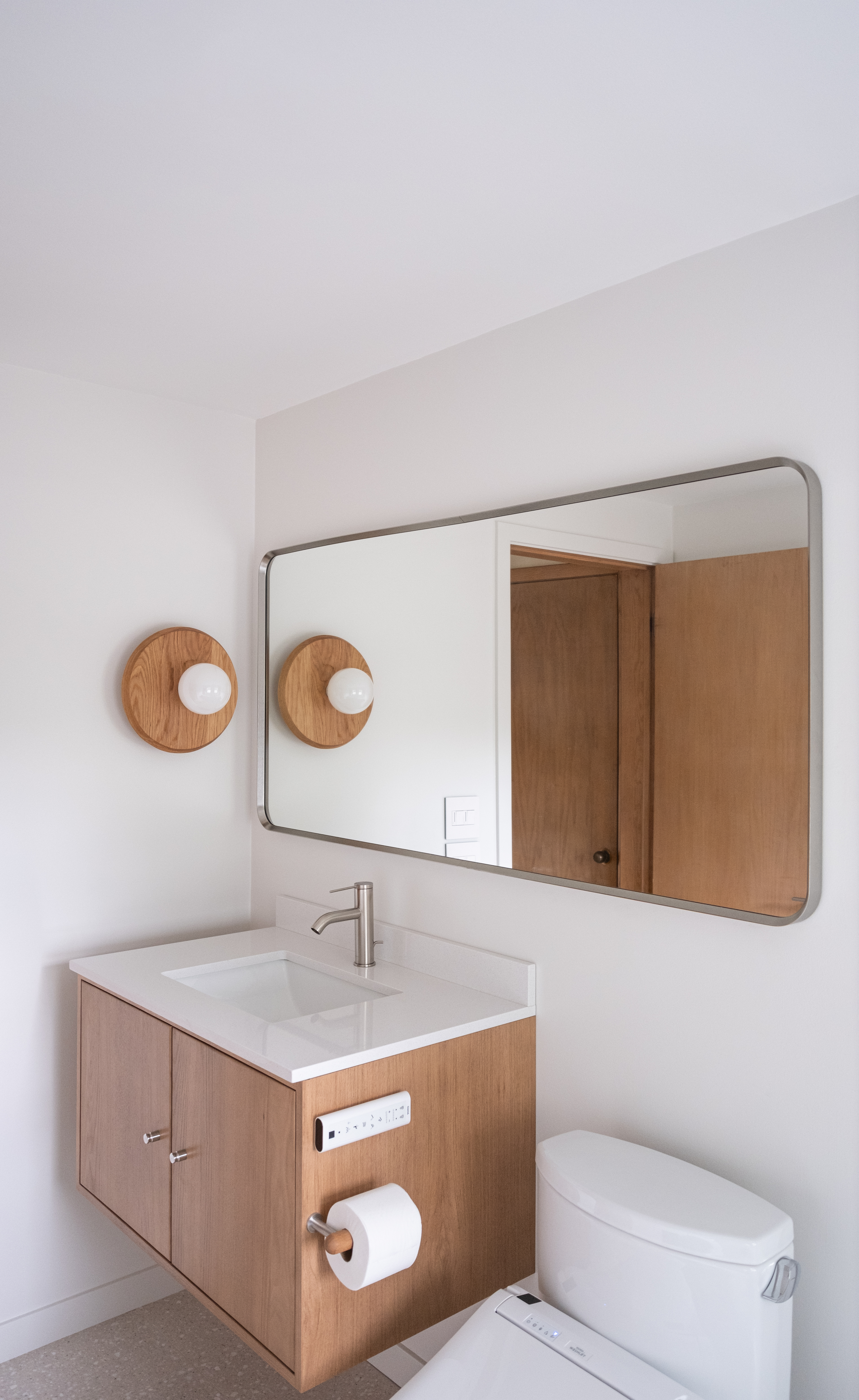 The rainshower, handshower, faucet, and associated controls are all finished in vibrant brushed nickel. The custom vanity is constructed of rift-sawn oak veneer fabricated by James LaChance paired with a wall-mount sink and a mirror clad in matching brushed nickel finish. The toilet features a washlet. The oak towel bars and toilet paper holders match the solid-core door and cabinetry.