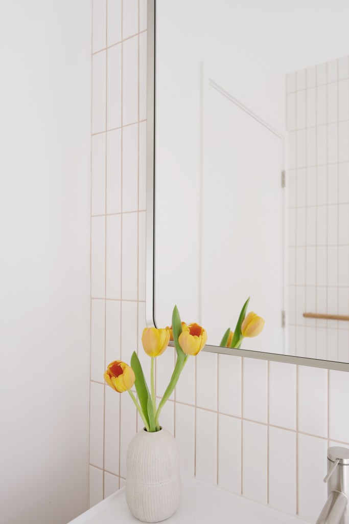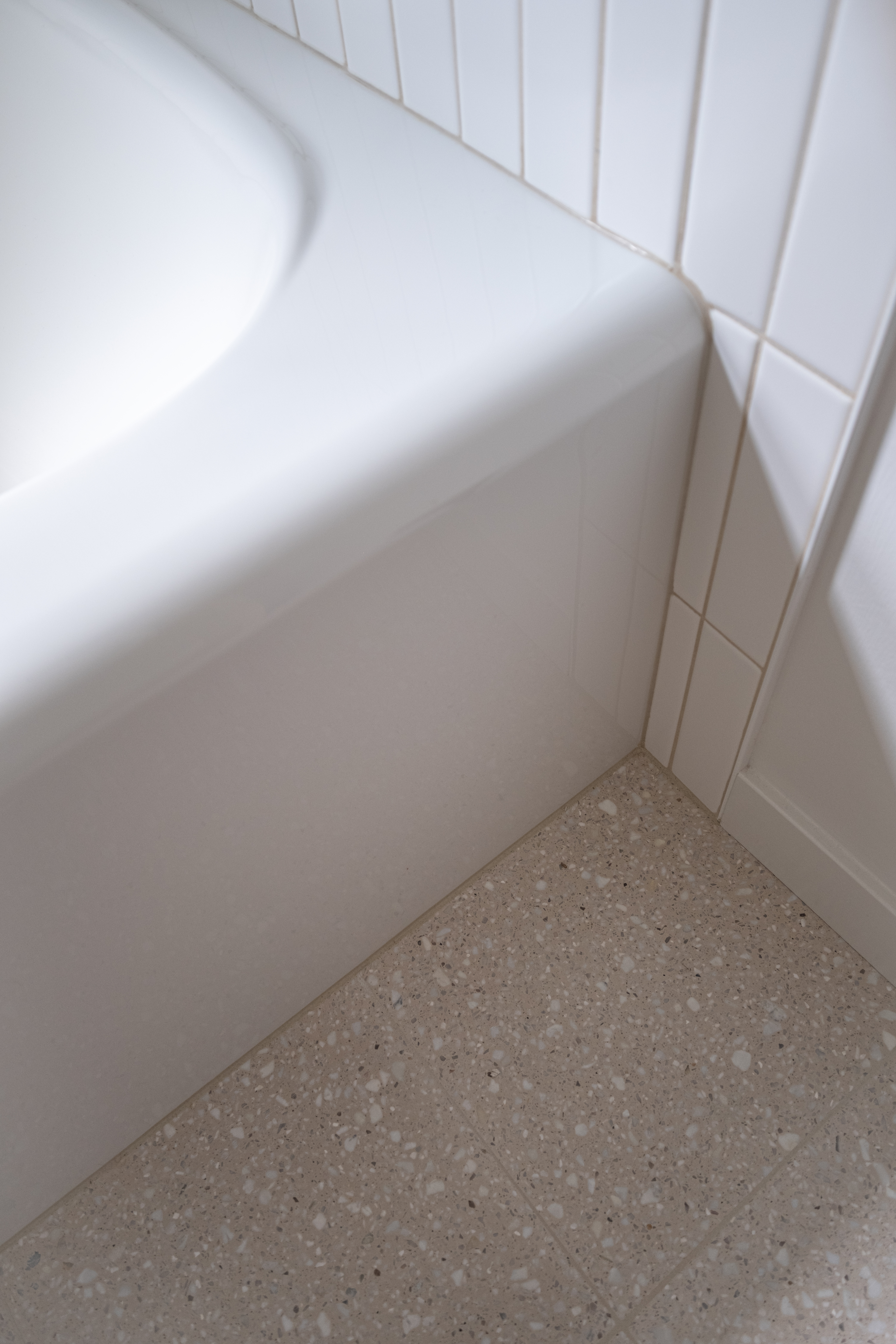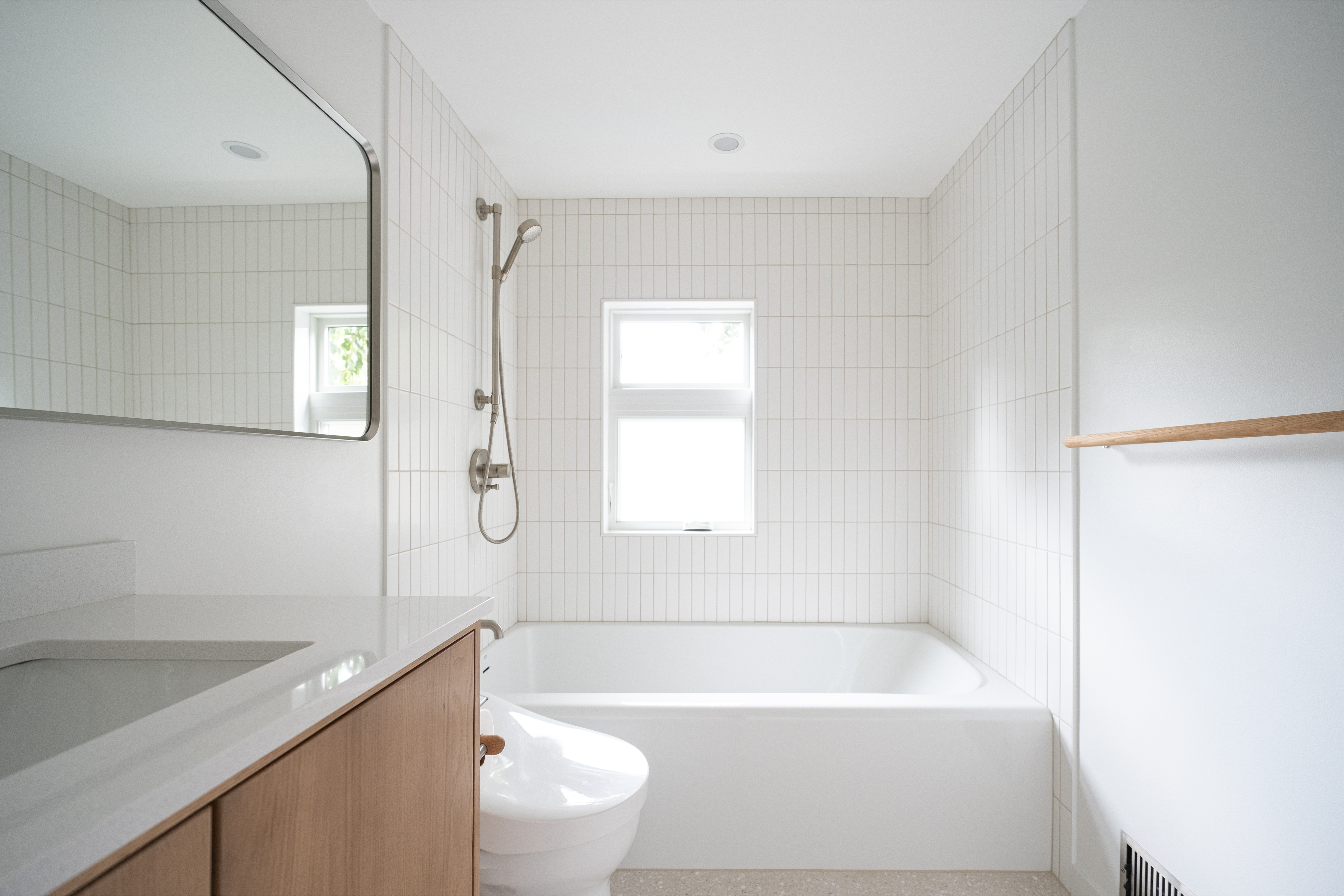 We carefully refreshed a pair of two bathrooms: one upstairs with a bathtub and one on the main level with a walk-in shower.