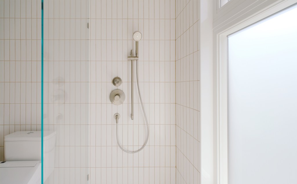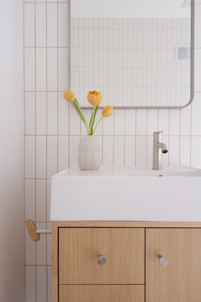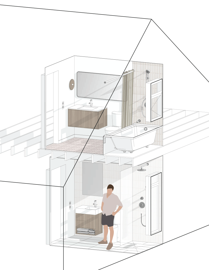 The selections allow for easy maintenance of space and selves. The original dim bathroom with a climb-in tub to a bright has been envisioned as an airy, walk-in, curbless shower and washroom.