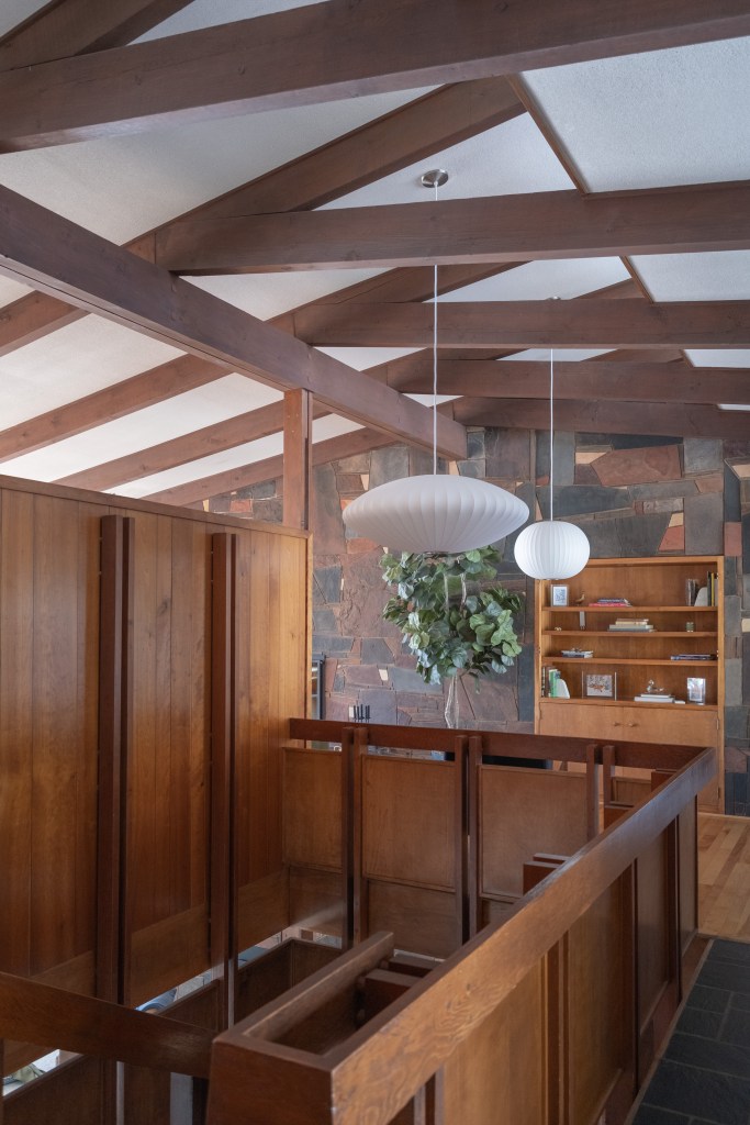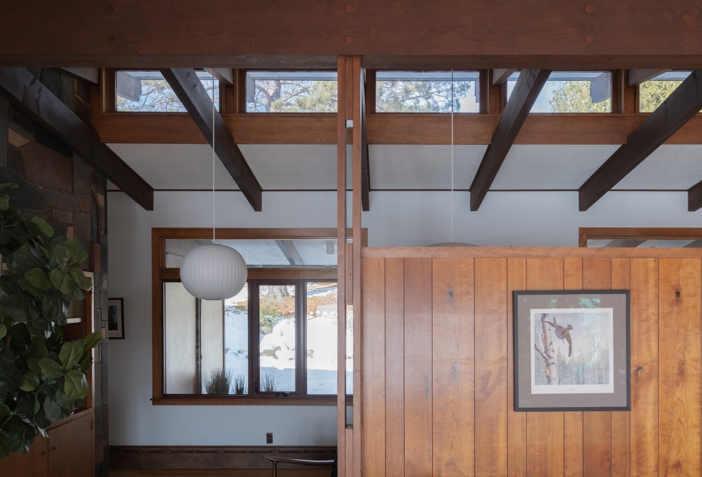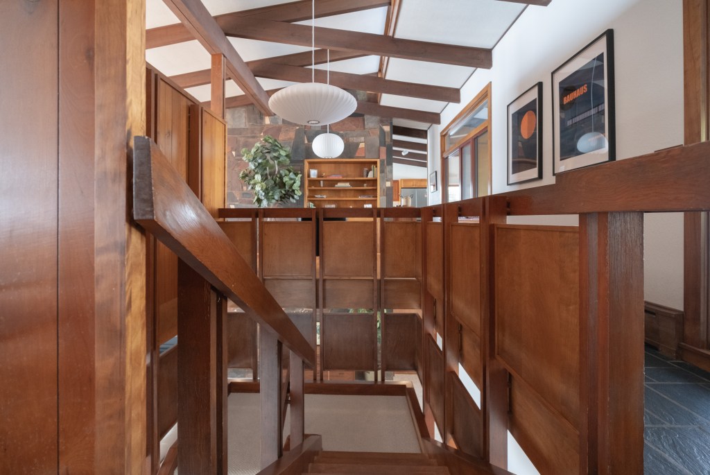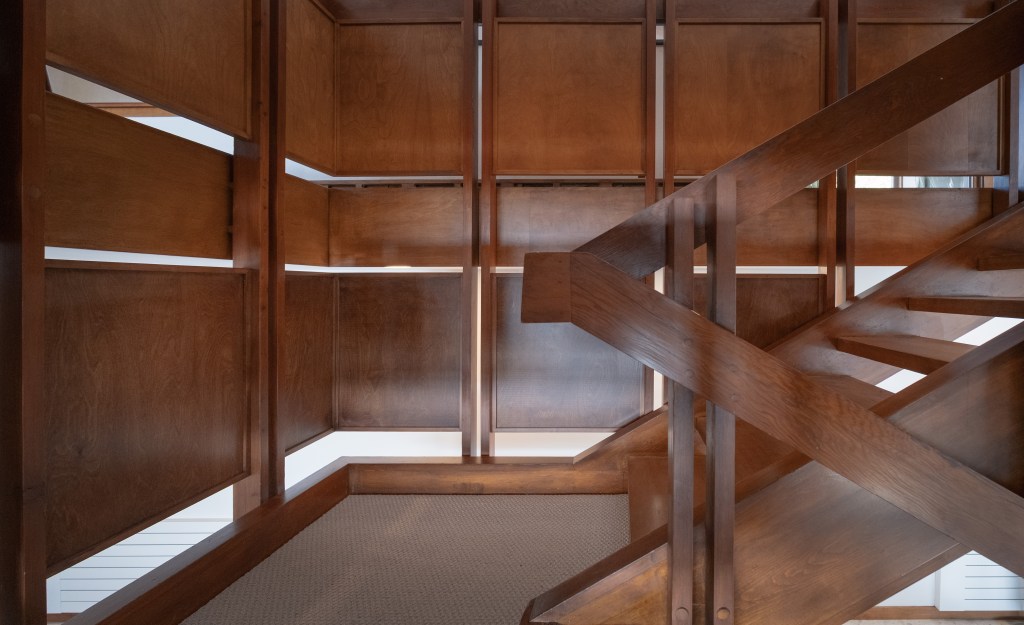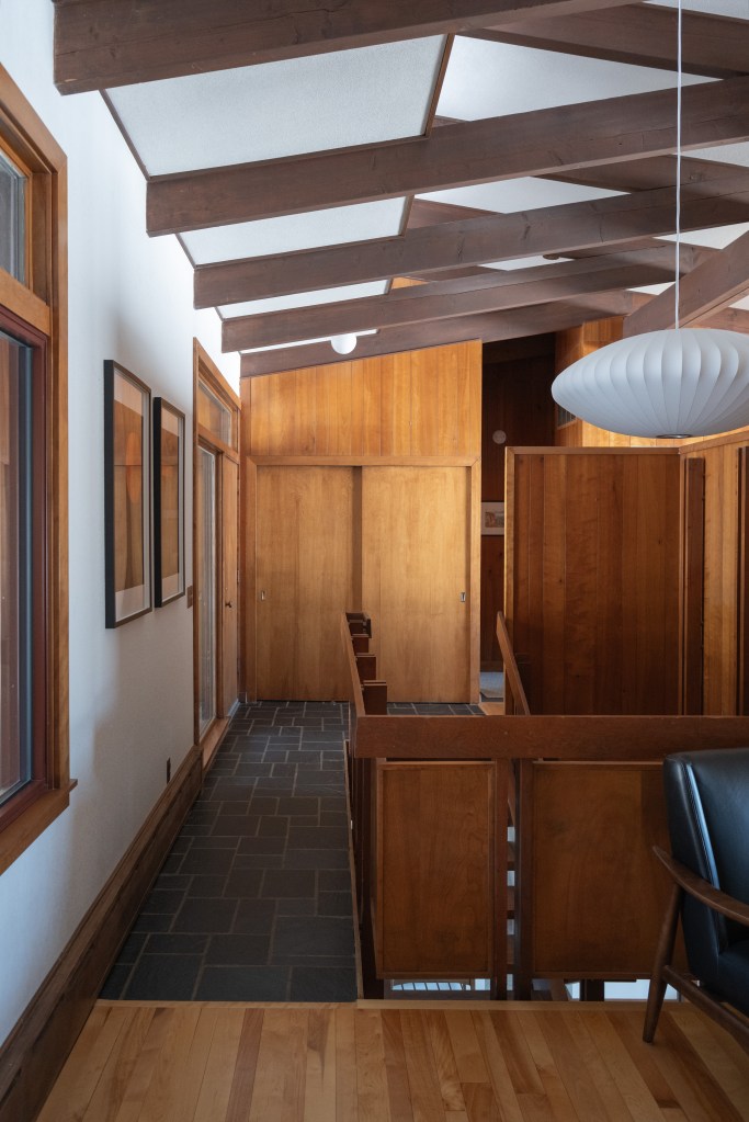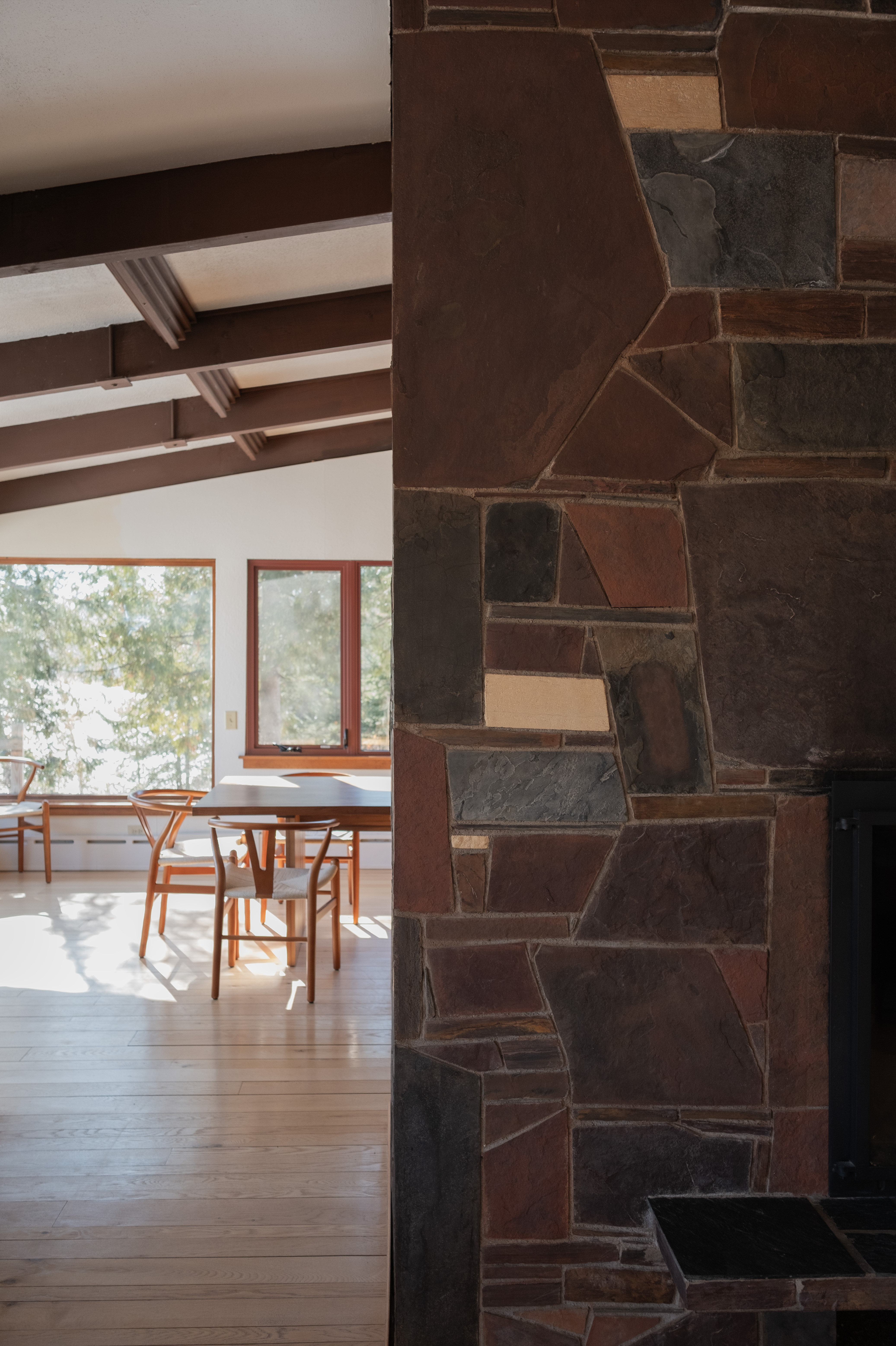 The original design of the Jyring & Whiteman home features a solid wood floating staircase that was missing guard rail panels which we simulated and seamlessly matched for safety. The other significant component of the original design is the dual floor fireplace volume constructed of Mesabi Red stone masonry. The entire design is a tribute to the lake country from the iron range to the arrowhead and all of the portages in between.