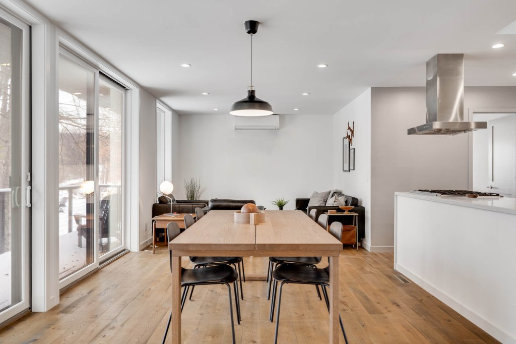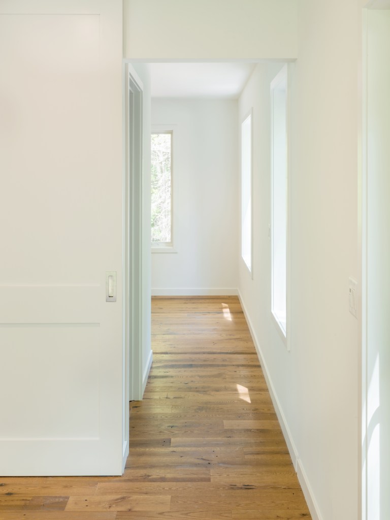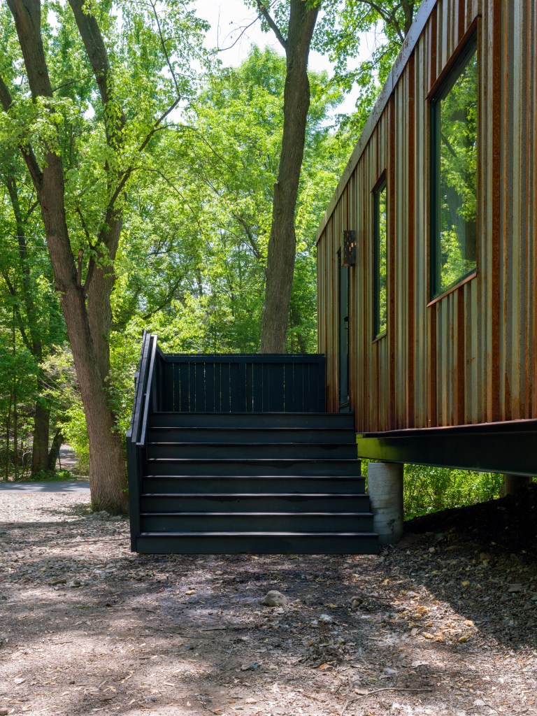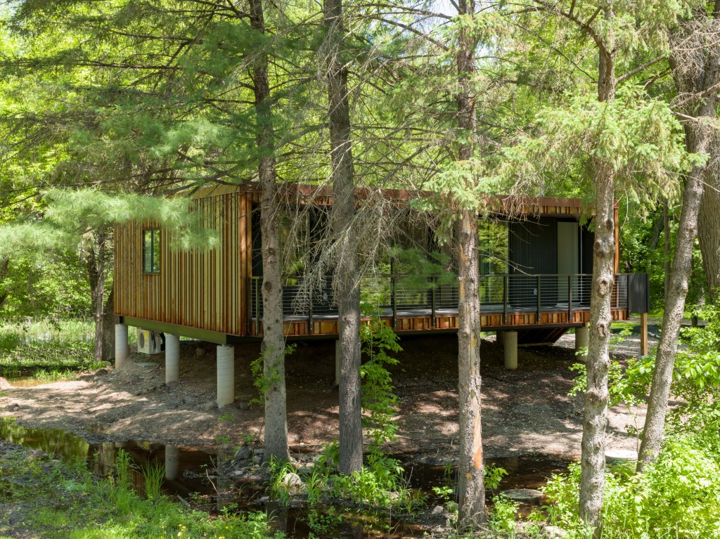 The home hovers above the surrounding wetland on helical piers anchored to bedrock 21 feet below grade. A custom weathering steel and black cedar skin blends the house into the surrounding woods. A wide, covered balcony and entry porch extend the living quarters out over the landscape, bridging the transition from inside to out.