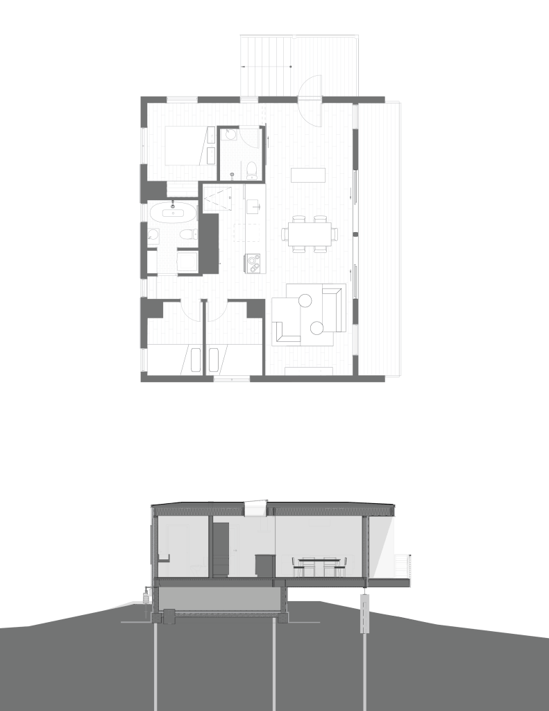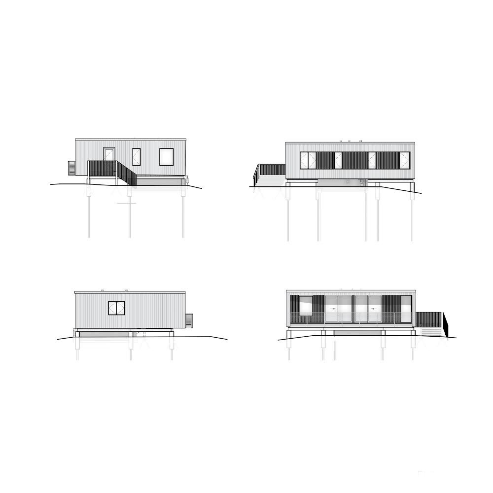 The Lake Elmo weeHouse is an efficient second home for a family from Australia who holiday in Minnesota. The footprint was constrained by a modest budget ($350K), the 100-year flood plane, and a 16’ maximum building height. Nonetheless, the 990 sf box contains 3 bedrooms, 2 bathrooms, and ample living space.