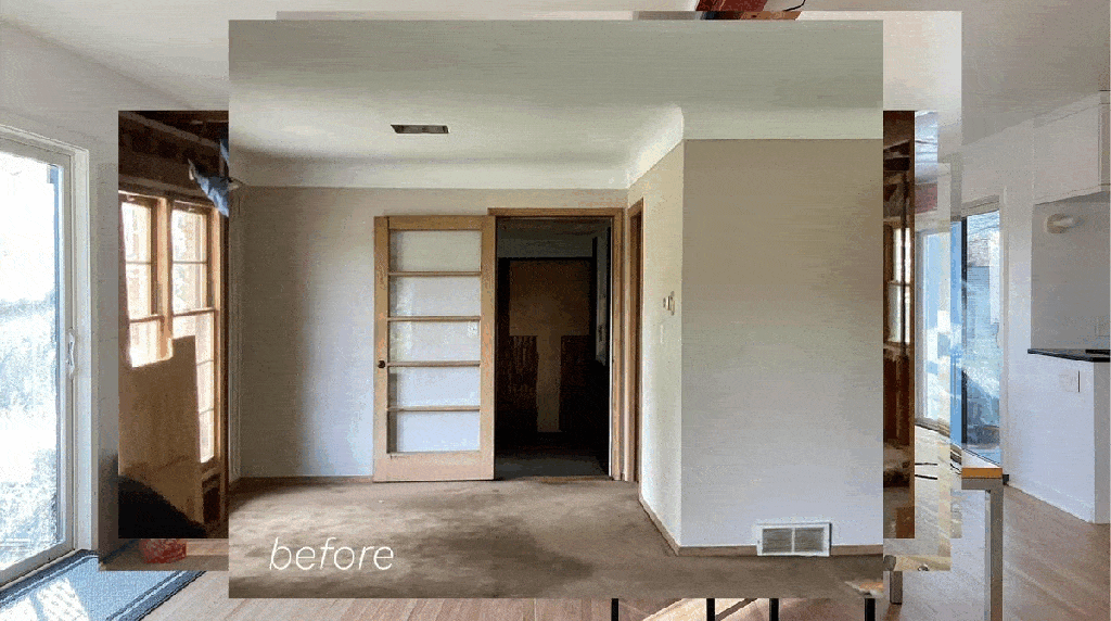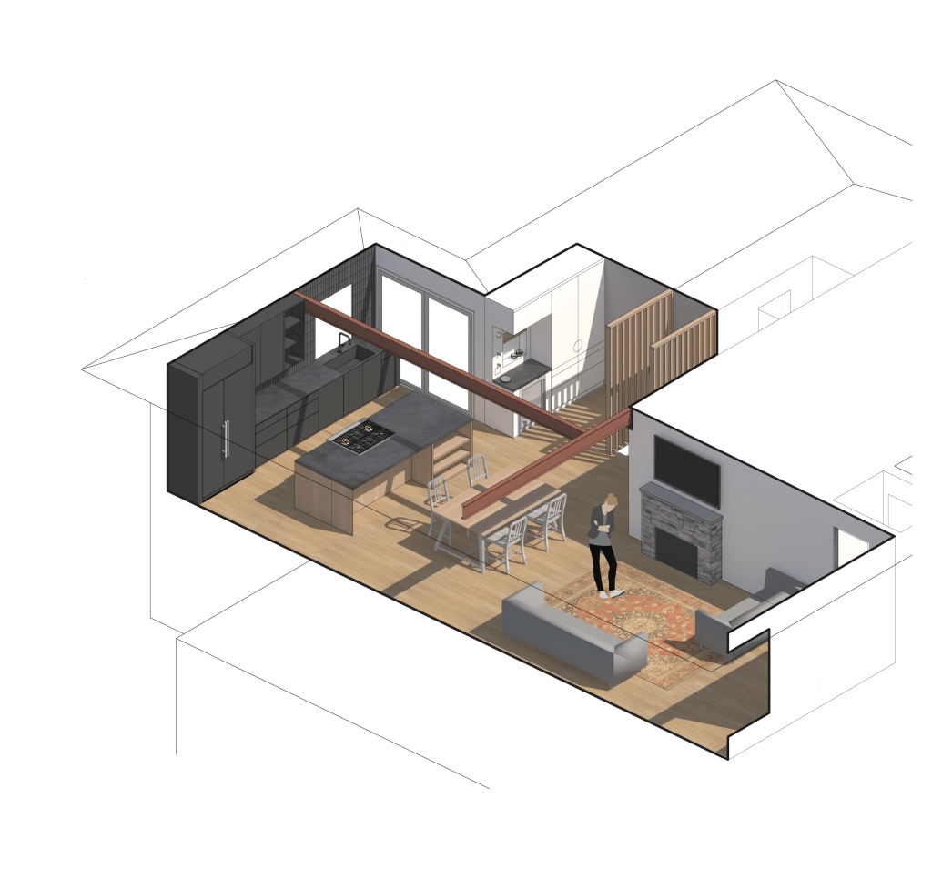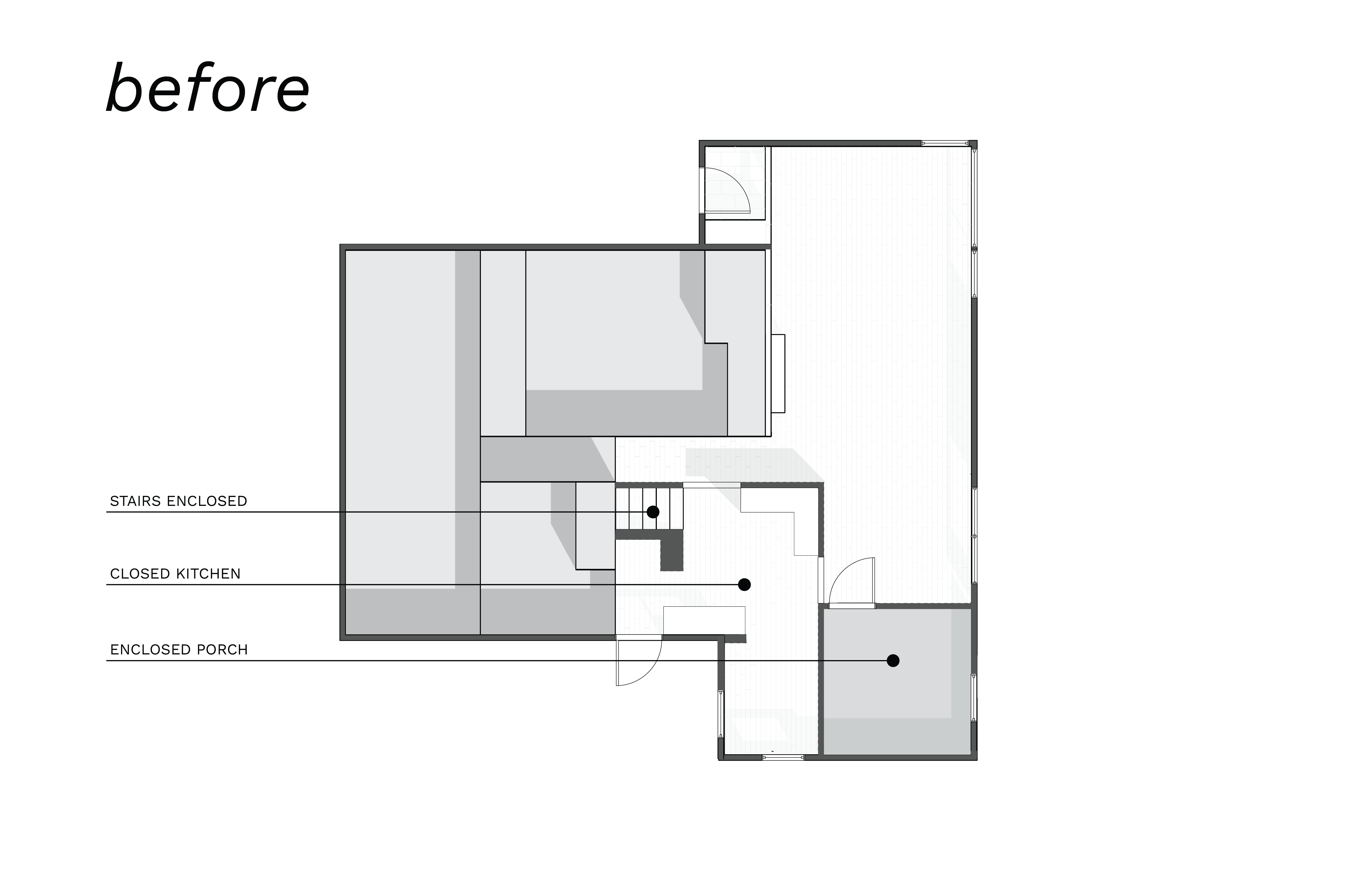 An existing porch (that someone had sided-over during a previous renovation) was incorporated into the main living space through the addition of a dropped steel beam. The now open-plan kitchen simplifies the circulation and connects the home to the side yards for dogs, kids, and parents to chase in and out, full-tilt, no-stopping.