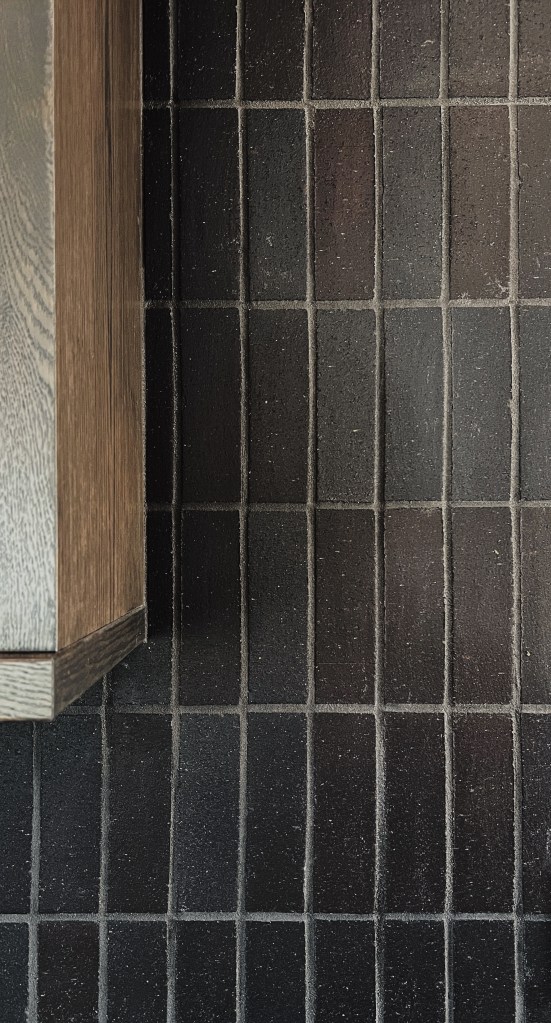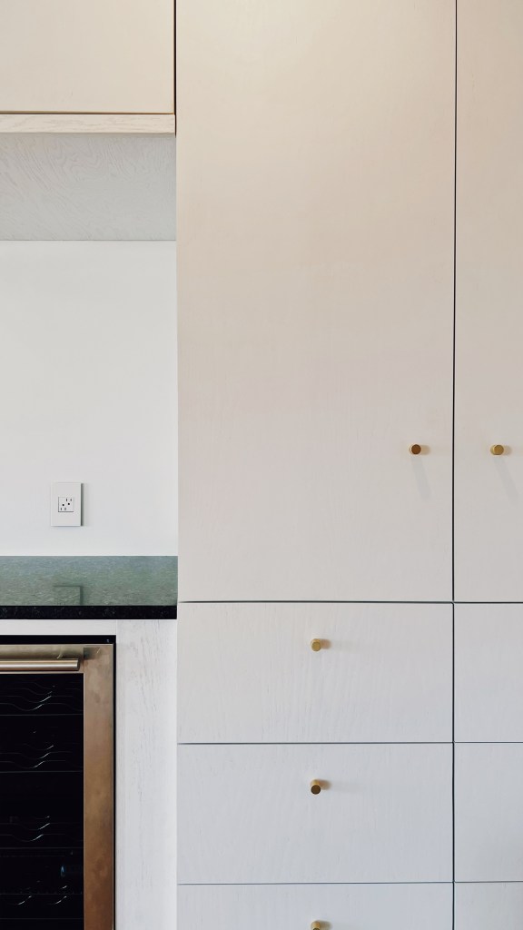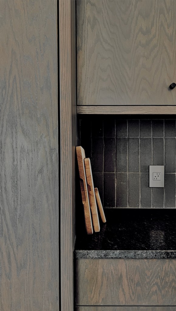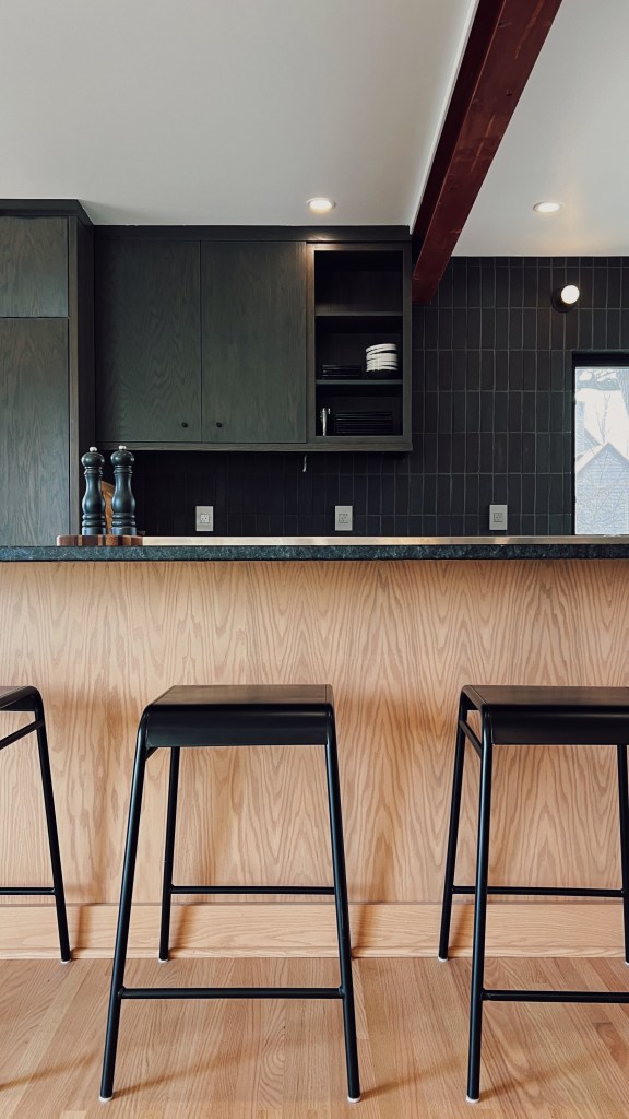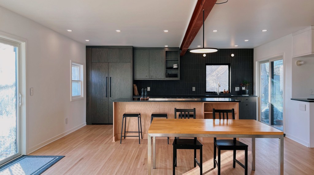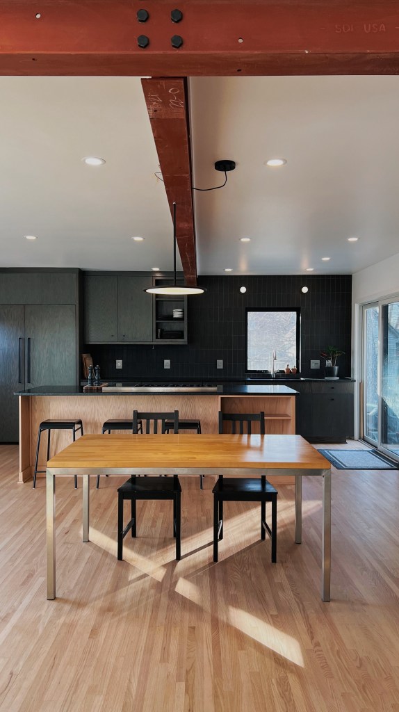 The design includes honed granite countertops, a brick-tiled backsplash, charcoal and oiled white oak cabinetry, and all-new appliances. Where old meets new, the red structural beams outline and trace what was once there. The cabinetry bars and pantry banks highlight the many dinners, get-togethers, and parties yet to be had.