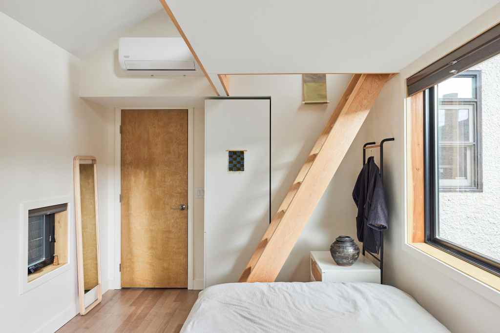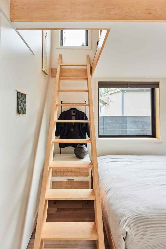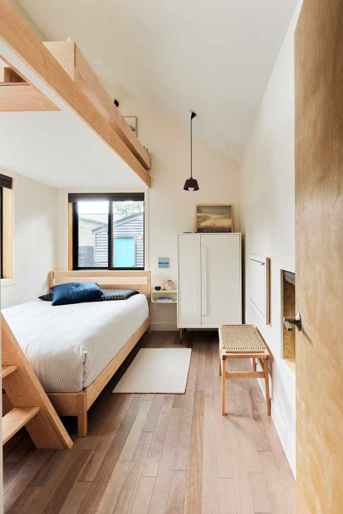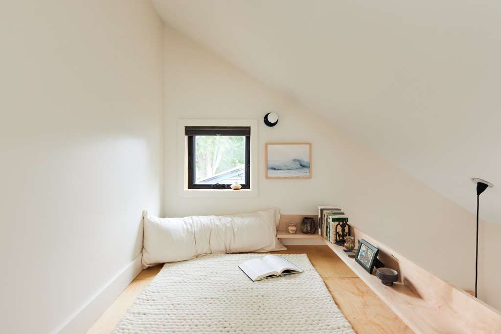 The interior utilizes the tall ceilings to pull off a small reading nook above a bedroom with some modest storage options tucked into the knuckle where the breezeway reconnects the bedroom to the rest of the house.