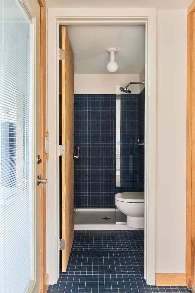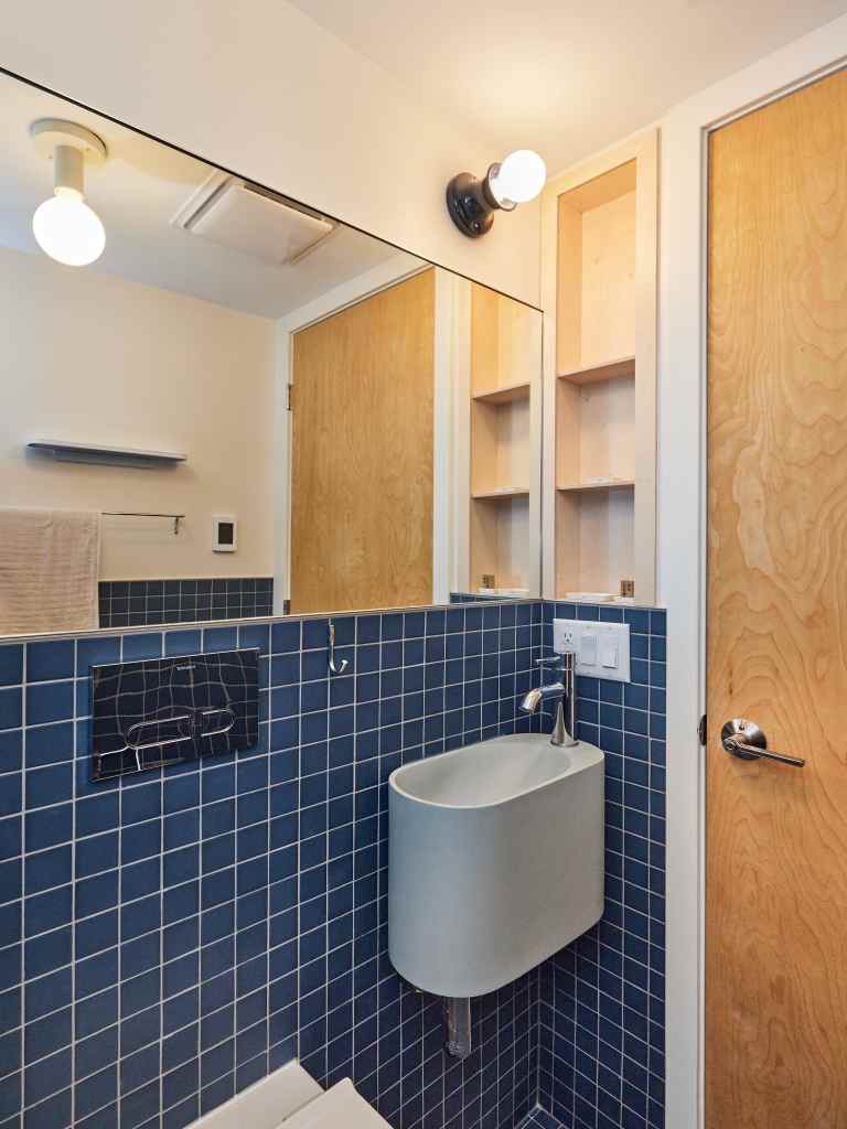 The new bathroom inserted in the old mudroom is the only bathroom on the main floor providing some longevity and flexibility for a future aging in place unit.