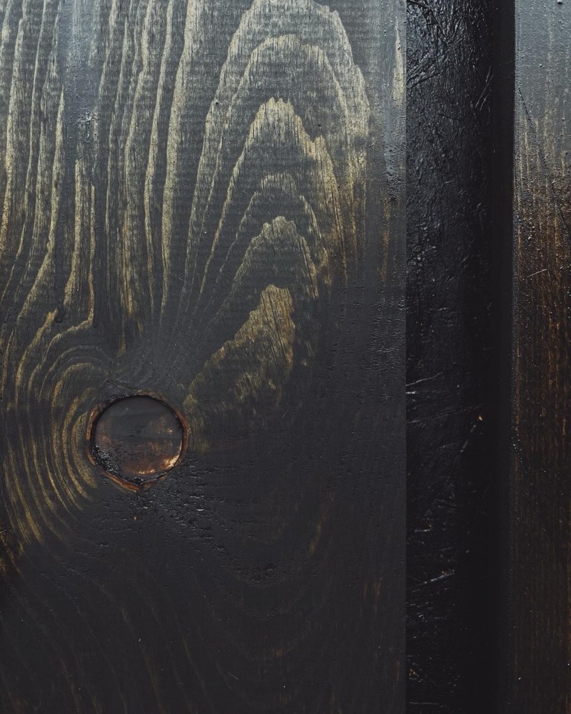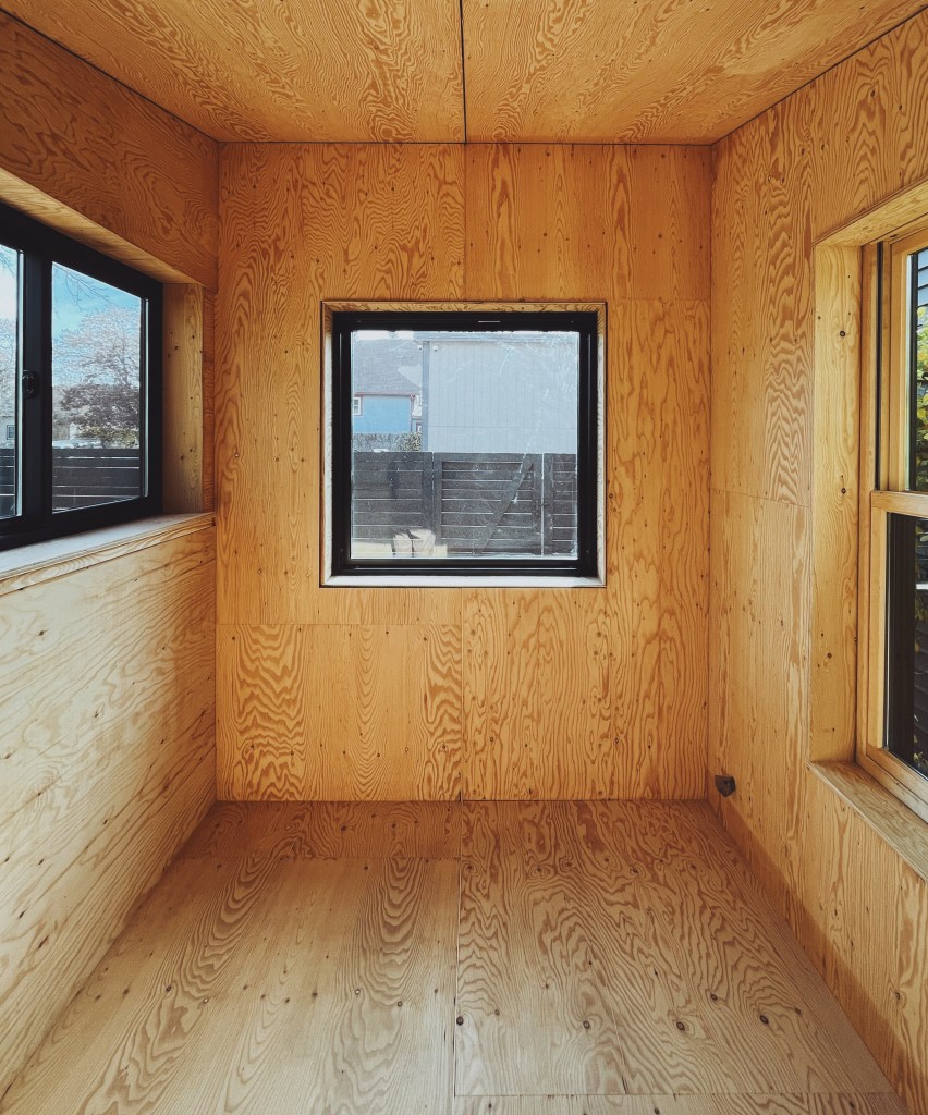 The interior face of the SIP structure is a Low-VOC plywood that contributes to the structural system and functions as the interior finish. The exterior pine rainscreen is coated in black pine tar with generous gapping for passive moisture management. The dark exterior provides context and contrast for the plywood interior to feel warm and welcoming while still being an extremely affordable, highly insulative, building system.