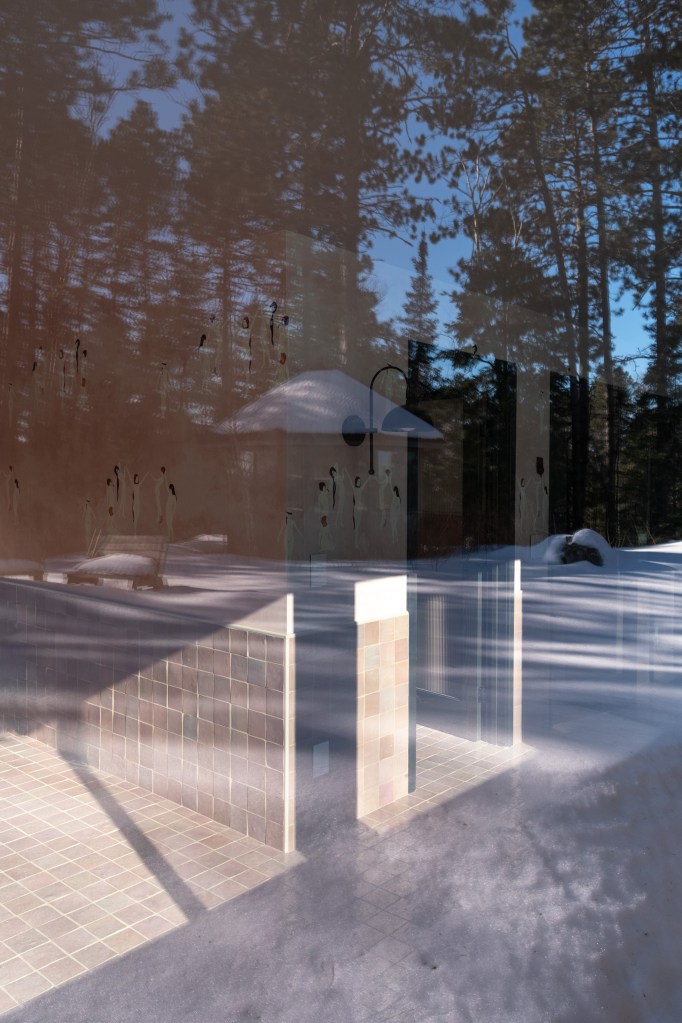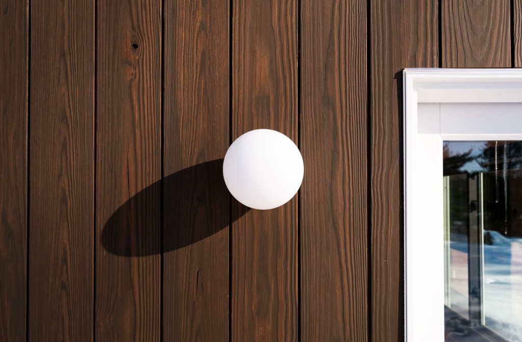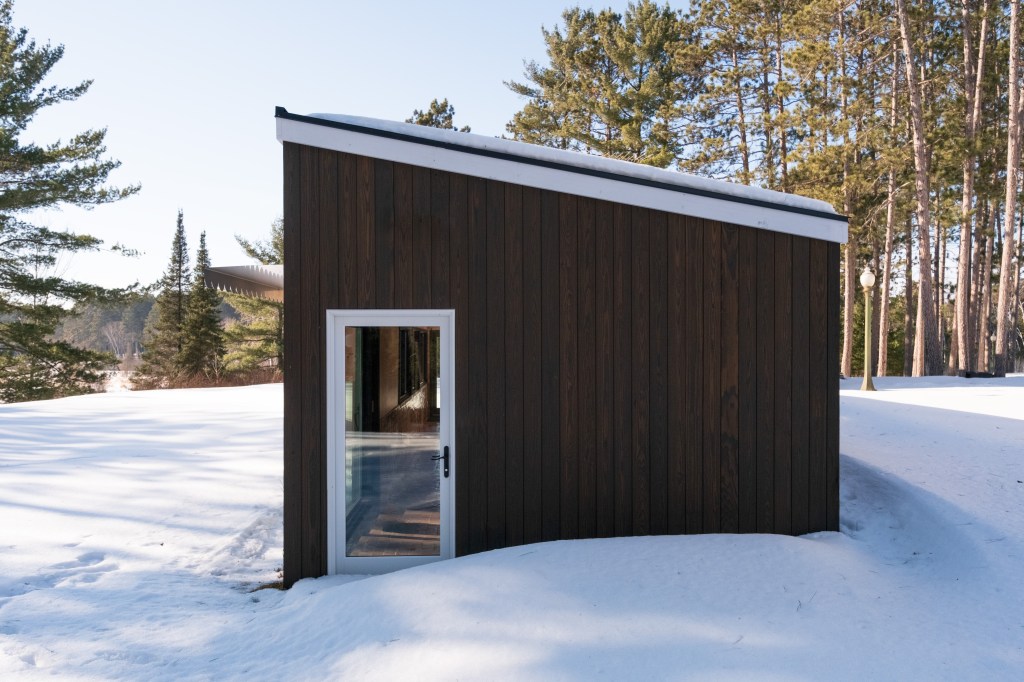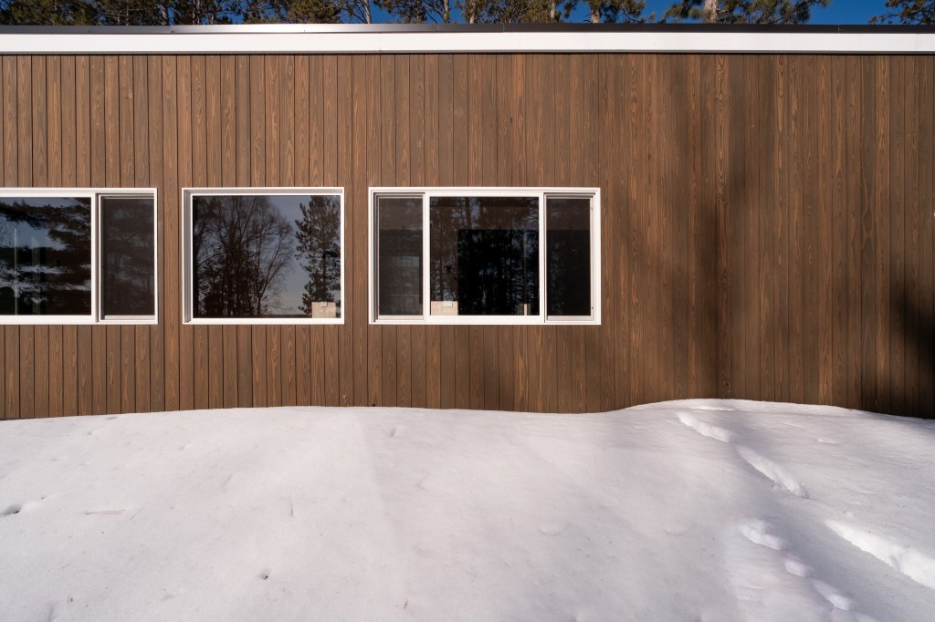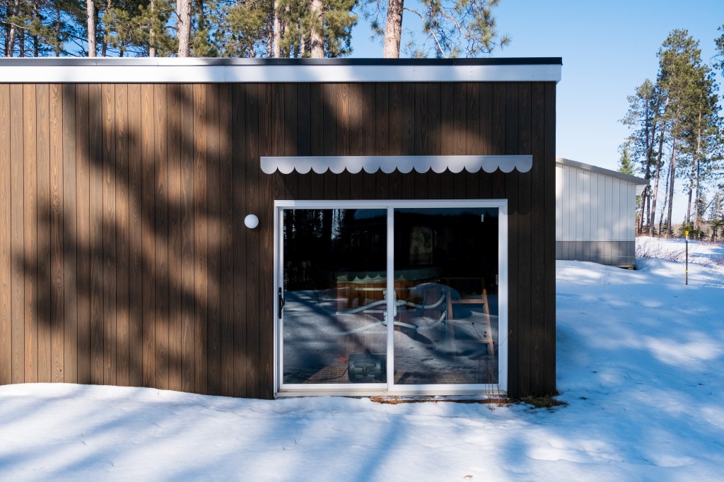 The siding is thermally modified, milled, and finished in Duluth, MN. The trim in white reinterprets a Ricardo Bofil aesthetic that pairs well with the scalloped stainless steel awning (custom designed by keep and fabricated in Minneapolis) along with the white orb sconces.