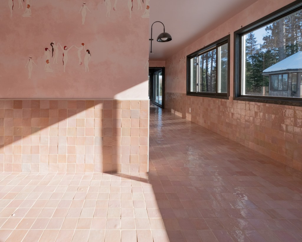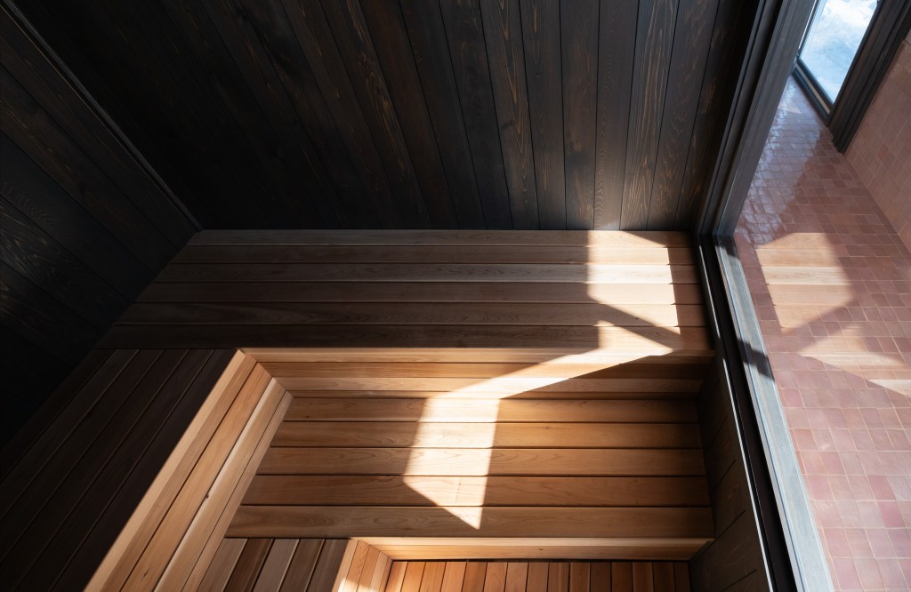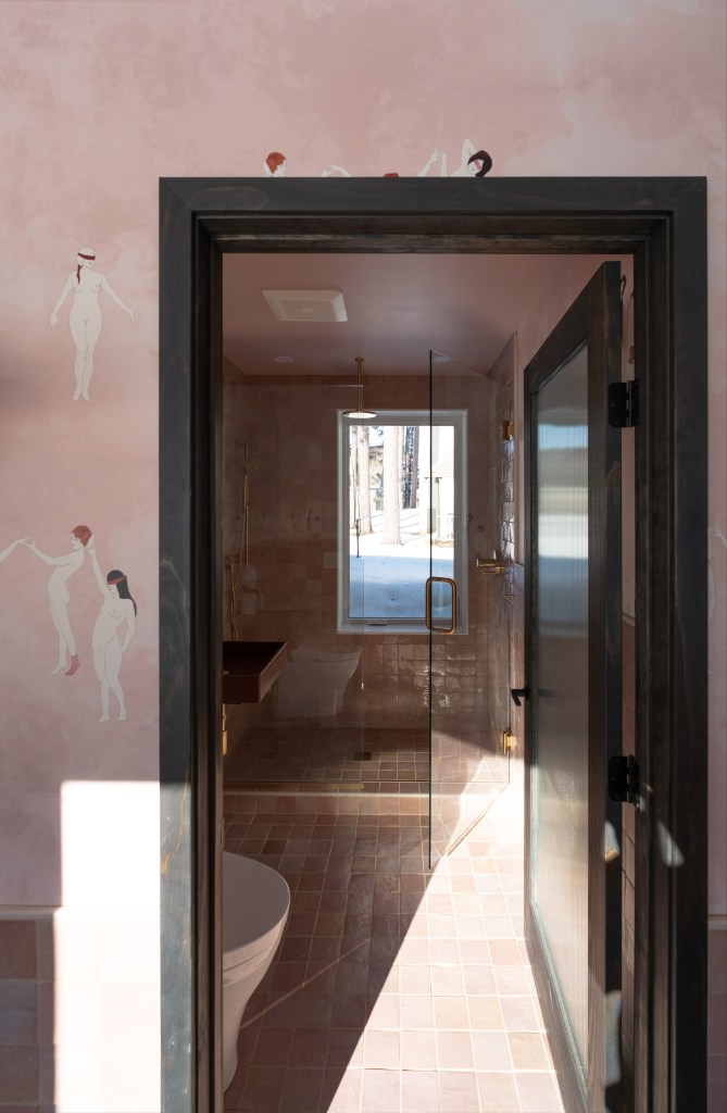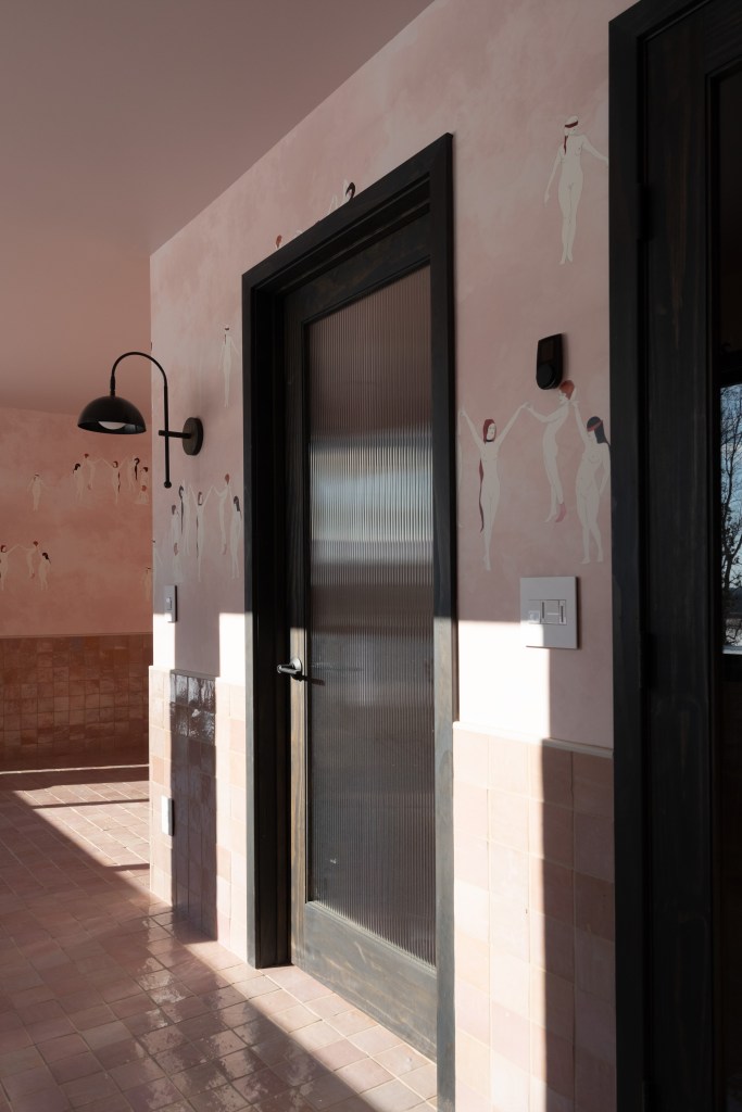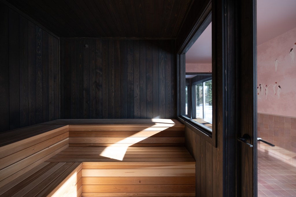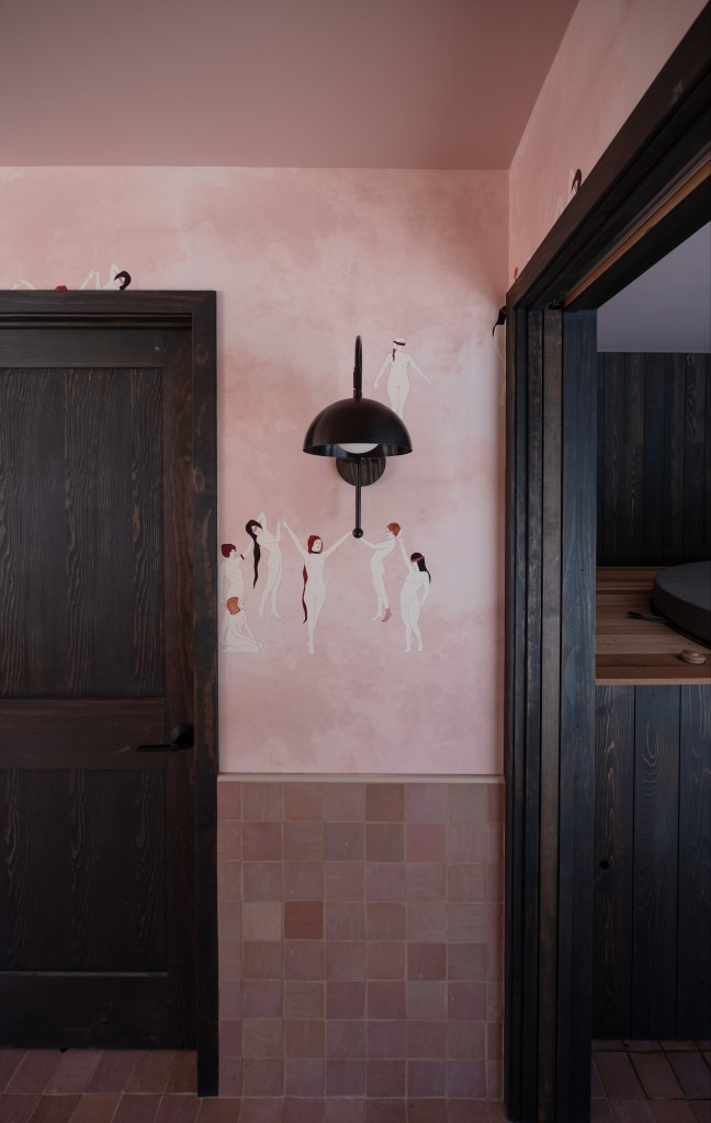 Inside, it is pink zellige on pink coven wallpaper, and color-matched pink ceilings. This saccharine cult of pink is only broken up by the sauna and soaking tub which are more subdued, raw cedar and charcoal cedar.