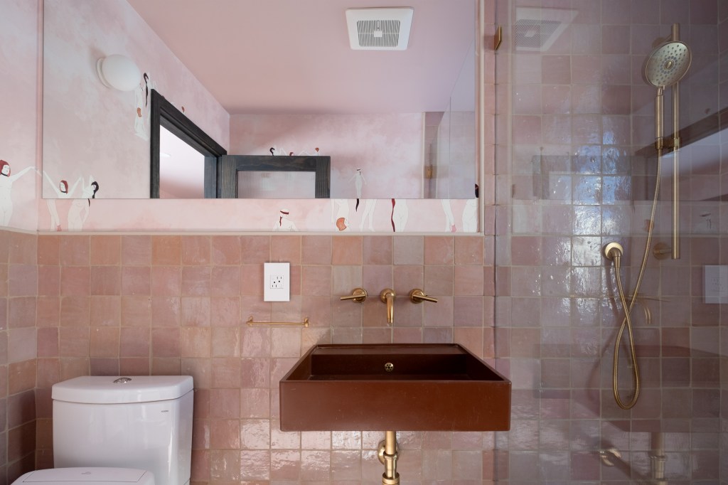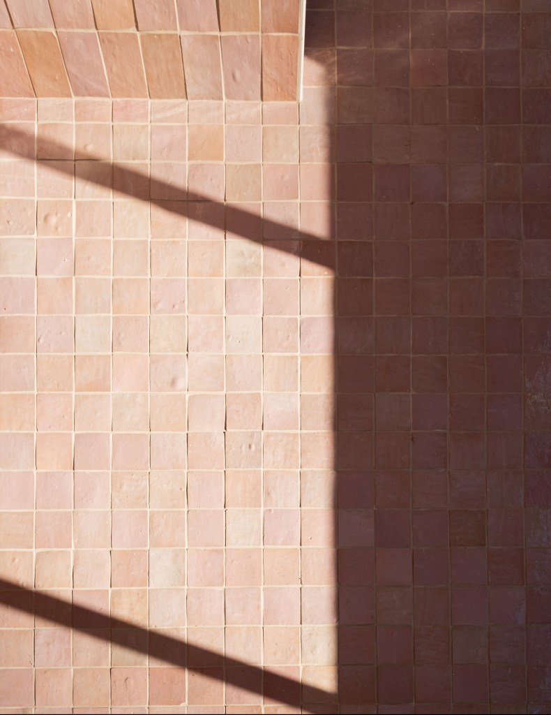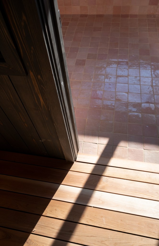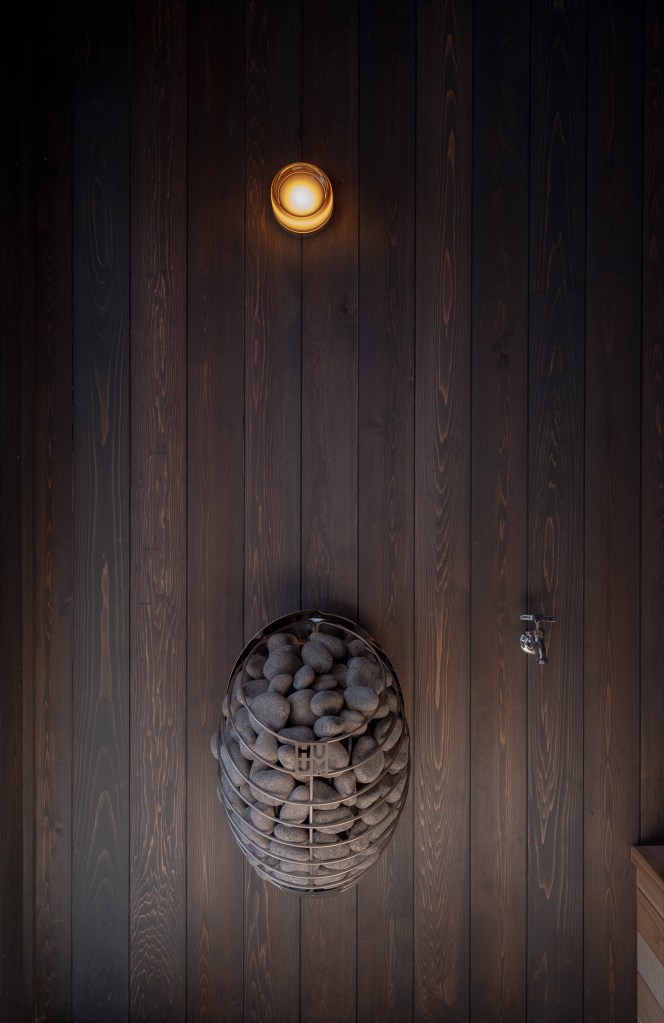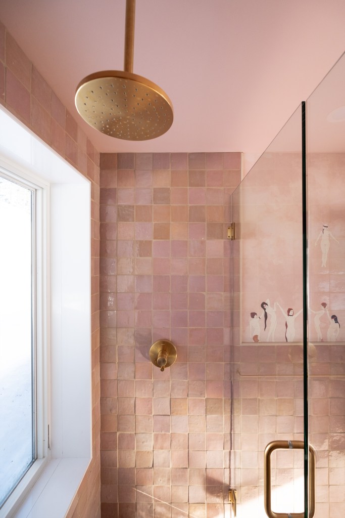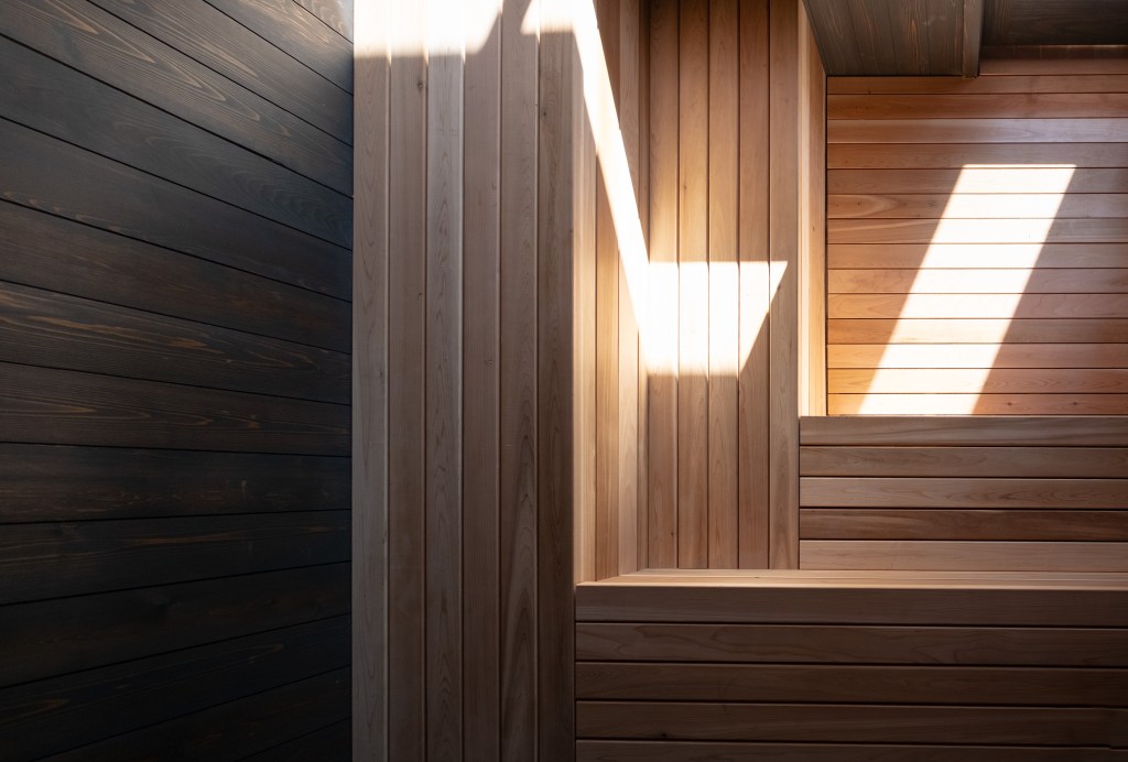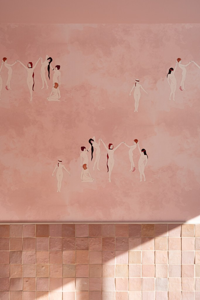 Inside, it is pink zellige on pink coven wallpaper, and color-matched pink ceilings. This saccharine cult of pink is only broken up by the sauna and soaking tub which are more subdued, raw cedar and charcoal cedar.